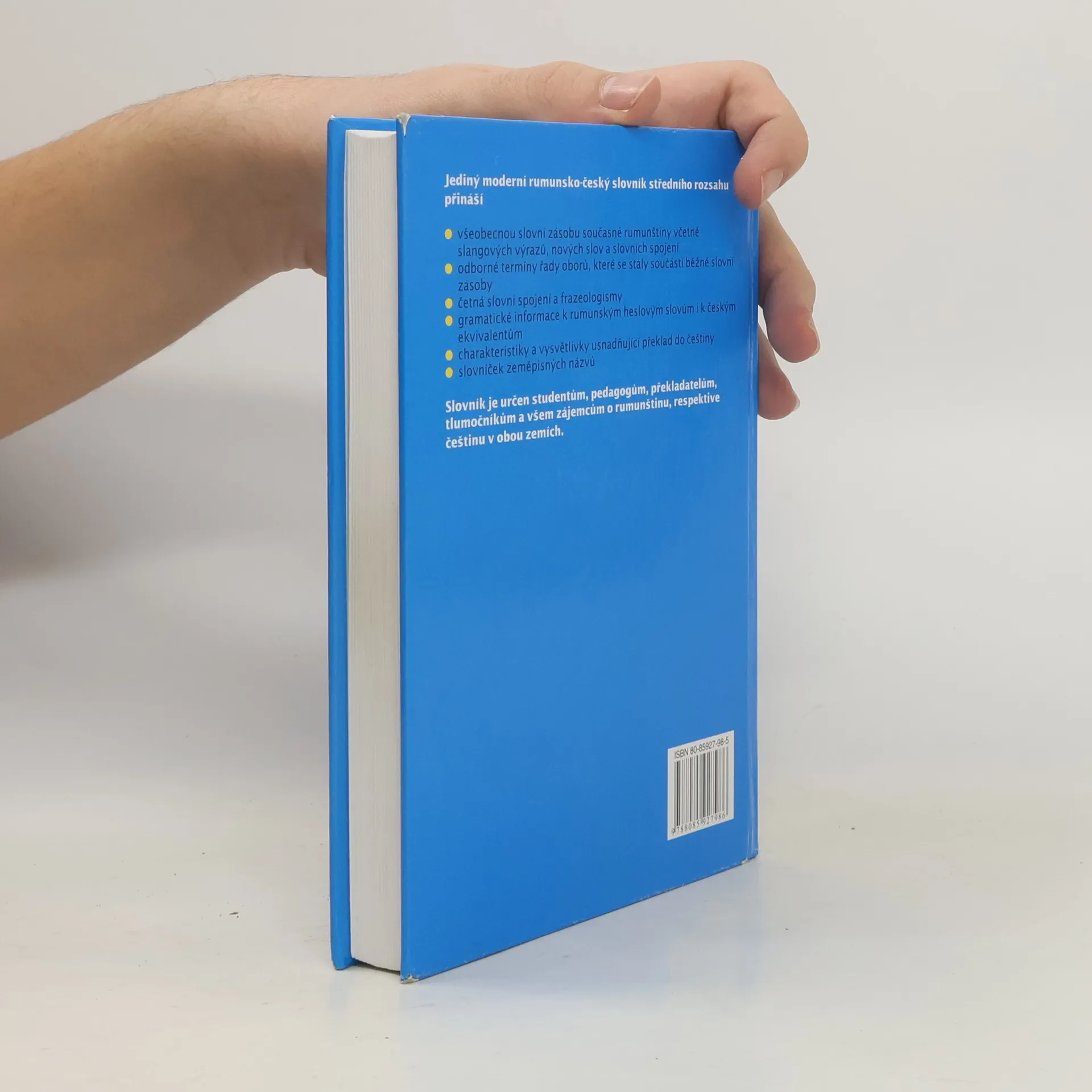 Jediný rozsáhlý rumunsko-český slovník obsahuje více než 37 000 rumunských výrazů a 62 000 českých ekvivalentů. Zahrnuty jsou všechny stylové vrstvy současné rumunštiny i běžné odborné výrazy z mnoha oborů, jako jsou technika, ekonomie, medicína, biologie, sport atd. Slovník obsahuje i nejnovější termíny z oblasti počítačů i dalších rychle se rozvíjejících oborů. Jednotlivé významy jsou v dostatečné míře vysvětleny a hesla poskytují bohatou nabídku českých ekvivalentů, což usnadňuje překládání i aktivní vyjadřování. Důsledně jsou uváděny rumunské i české gramatické informace. Samostatnou část tvoří přehled zeměpisných jmen. Slovník je určen studentům, pedagogům, překladatelům, tlumočníkům a všem zájemcům o rumunštinu.