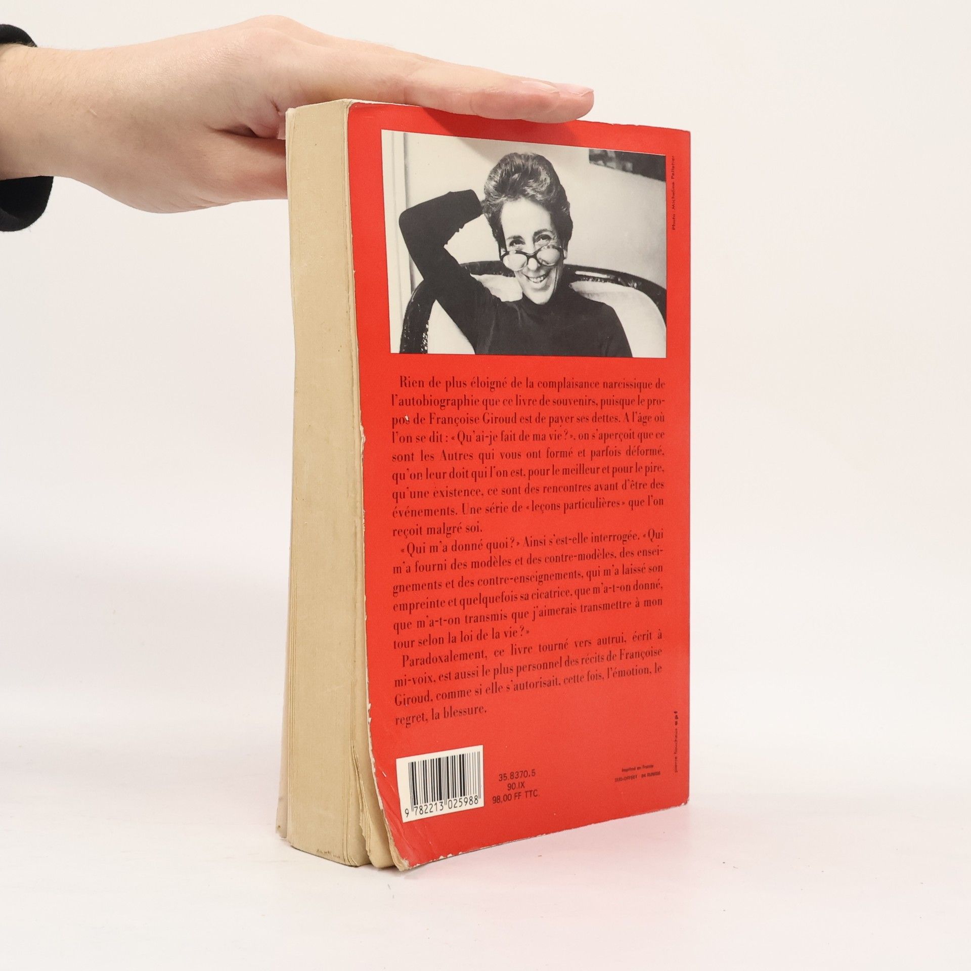 Rien de plus eloigne de la complaisance narcissique de l'autobiographie que ce livre de souvenirs, puisque le propos de Francoise Giroud est de payer ses dettes. A l'age ou l'on se dit: " Qu'ai-je fait de ma vie?," on s'apercoit que ce sont les Autres qui vous ont forme et parfois deforme, qu'on leur doit qui l'on est, pour le meilleur et pour le pire, qu'une existence, ce sont des rencontres avant d'etre des evenements. Une serie de " lecons particulieres " que l'on recoit malgre soi." Qui m'a donne quoi? " Ainsi s'est-elle interrogee. " Qui m'a fourni des modeles et des contre-modeles, des enseignements et des contre-enseignements, qui m'a laisse son empreinte et quelquefois sa cicatrice, que m'a-t-on donne, que m'a-t-on transmis que j'aimerais transmettre a mon tour selon la loi de la vie? "Paradoxalement, ce livre tourne vers autrui, ecrit a mi-voix, est aussi le plus personnel des recits de Francoise Giroud, comme si elle s'autorisait, cette fois, l'emotion, le regret, la blessure."