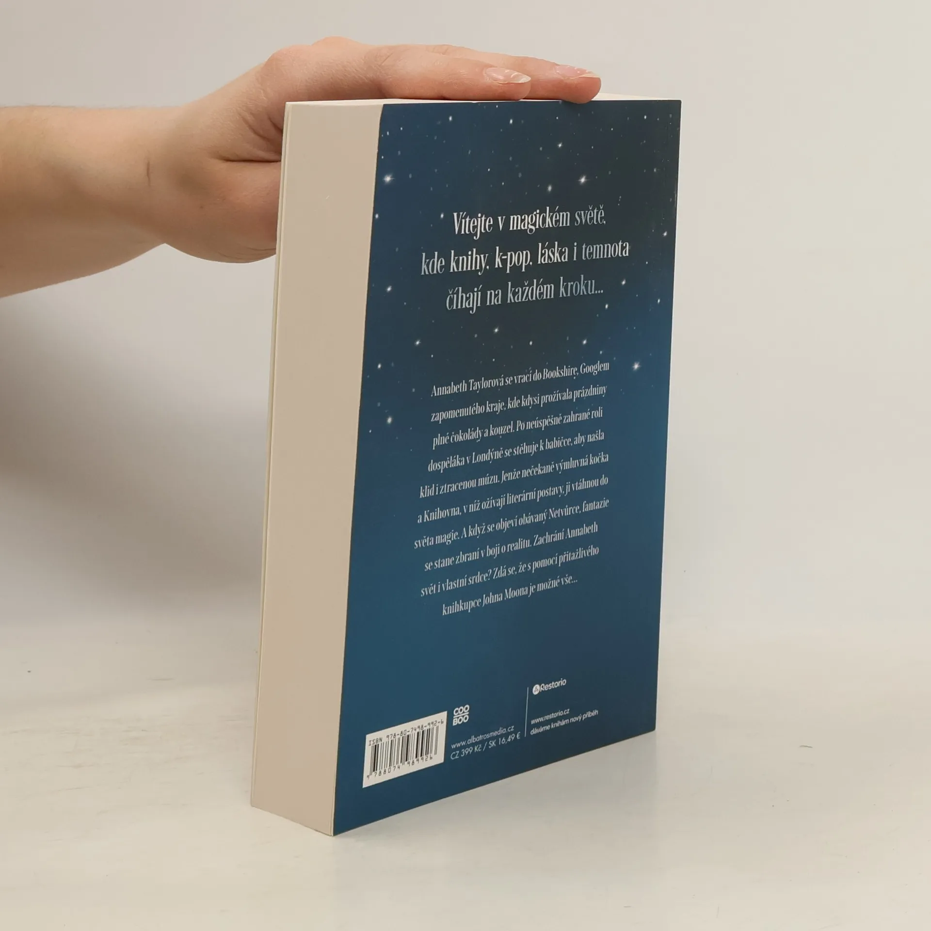 Vítejte v magickém světě, kde knihy, k-pop, láska i temnota číhají na každém kroku… Annabeth Taylorová se vrací do Bookshire, Googlem zapomenutého kraje, kde kdysi prožívala prázdniny plné čokolády a kouzel. Po neúspěšně zahrané roli dospěláka v Londýně se stěhuje k babičce, aby našla klid i ztracenou múzu. Jenže nečekaně výmluvná kočka a Knihovna, v níž ožívají literární postavy, ji vtáhnou do světa magie. A když se objeví obávaný Netvůrce, fantazie se stane zbraní v boji o realitu. Zachrání Annabeth svět i své srdce? Zdá se, že s pomocí přitažlivého knihkupce Johna Moona je možné vše…
