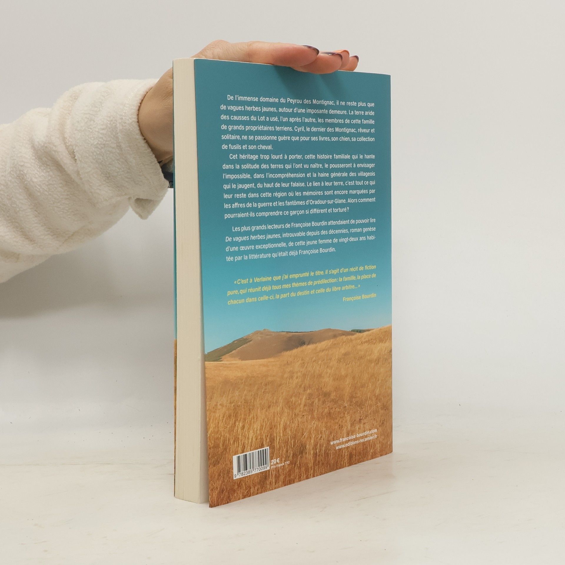 " C'est à Verlaine que j'ai emprunté le titre. Il s'agit d'un récit de fiction pure, qui réunit déjà tous mes thèmes de prédilection : la famille, la place de chacun dans celle-ci, la part du destin et celle du libre arbitre... " - Françoise Bourdin De l'immense domaine du Peyrou des Montignac, il ne reste plus que de " vagues herbes jaunes ", autour d'une imposante demeure. La terre aride du Lot a usé, l'un après l'autre, les membres de cette famille de grands propriétaires terriens. Cyril, le dernier des Montignac, rêveur et solitaire, ne se passionne guère que pour ses livres, son chien, sa collection de fusils et son cheval.Cet héritage trop lourd à porter, cette histoire familiale qui le hante dans la solitude des terres qui l'ont vu naître, le pousseront à envisager l'impossible, dans l'incompréhension et la haine générale des villageois qui le jaugent, du haut de leur falaise. Le lien à leur terre, c'est tout ce qui leur reste dans cette région où les mémoires sont encore marquées par les affres de la guerre et les fantômes d'Oradour-sur-Glane. Alors comment pourraient-ils comprendre ce garçon si différent et torturé ?Les lecteurs de Françoise Bourdin attendaient de pouvoir lire De vagues herbes jaunes , introuvable depuis des décennies, roman genèse d'une oeuvre exceptionnelle de cette jeune femme de vingt-deux ans habitée par la littérature qu'était déjà Françoise Bourdin.