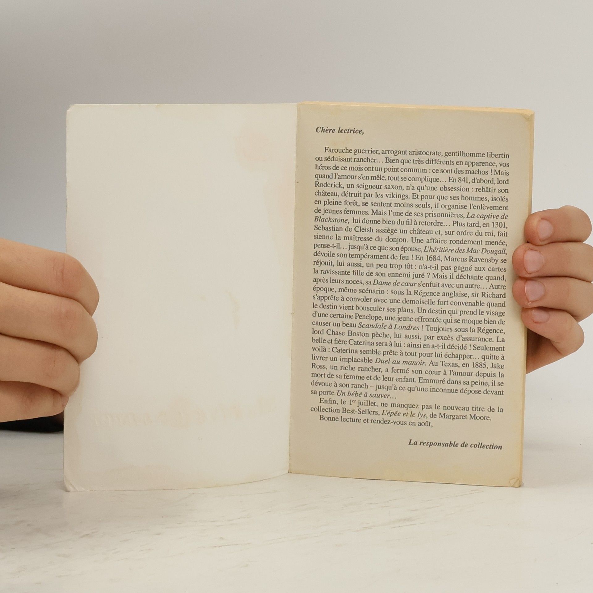 Texas, 1885. Quand son beau-père, un notable influent, tue sa mère dans l'un des accès de violence dont il est coutumier, Emma Douglas s'enfuit du foyer familial avec une seule idée en tête : protéger sa demi-soeur Molly, un bébé d'un an. Mais comment survivre, sans argent ni travail ? En désespoir de cause, elle rédige une lettre où elle affirme être la mère du bébé, n'avoir pas de mari, et souffrir d'une maladie incurable. Puis elle dépose Molly, avec la missive, devant la porte d'un inconnu fugitivement aperçu le matin même, et dont la physionomie lui inspire confiance. Avec un peu de chance, espère-t-elle, il n'aura pas le cœur d'abandonner l'enfant et se mettra en quête d'une nurse pour s'en occuper. Elle n'aura plus alors qu'à postuler sous une fausse identité...