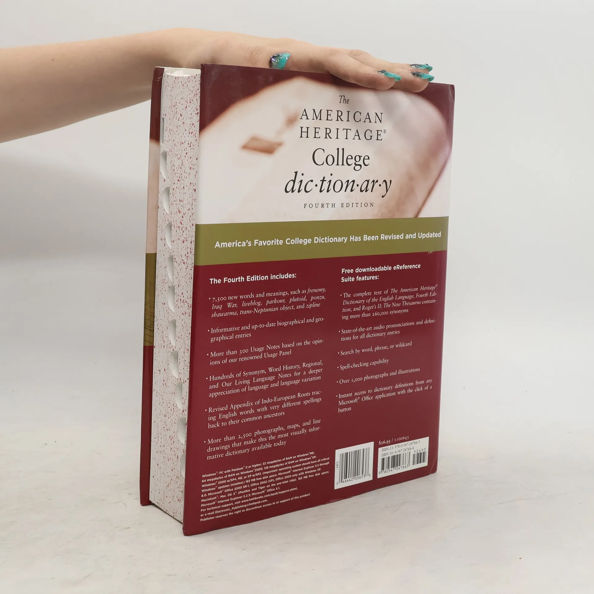 The newly updated American Heritage® College Dictionary, Fourth Edition, presents the very best that a college dictionary can offer. It features all the qualities that have distinguished the American Heritage® name for decades: a clear and accessible defining style, expert usage advice, and more than 2,500 photographs and drawings that enhance the definitions and invite browsing. New to this updated release are recently prominent terms such as blue state, edamame, and fattoush. The Periodic Table of the Elements includes the newest element, roentgenium. Biographical entries are fully up-to-date, and geographical entries reflect the latest geopolitical changes. And now for the first time, The American Heritage® College Dictionary includes a registration card with a unique passkey code that allows the user to download directly to a PC or Mac the entire contents of The American Heritage® Dictionary of the English Language, Fourth Edition, as well as Roget’s II: The New Thesaurus. The eReference Suite can be accessed within Microsoft® Office applications at the click of a button. This remarkable $34.95 value is free with the print product.