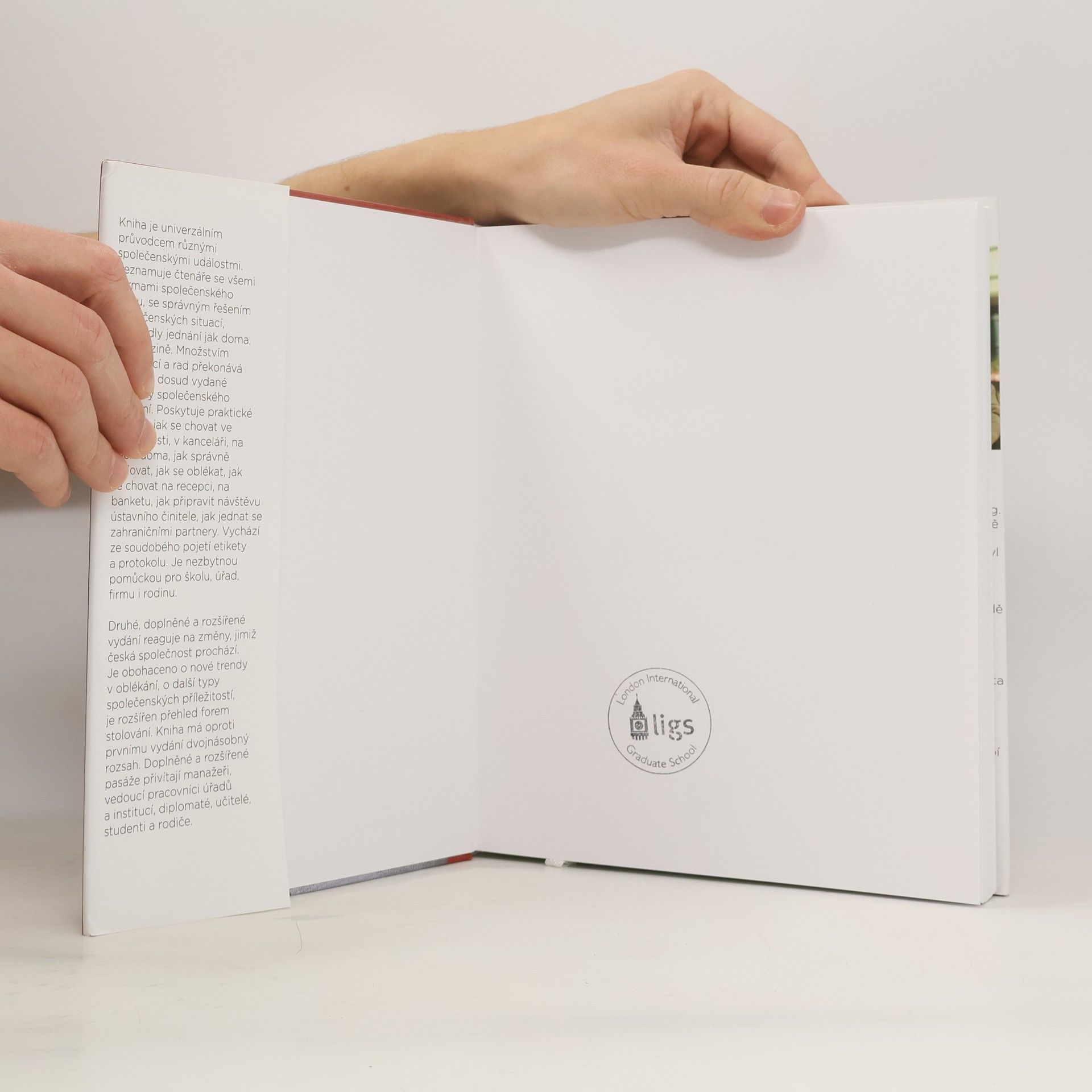 Kniha je univerzálním průvodcem různými společenskými událostmi. Seznamuje čtenáře se všemi formami společenského styku, se správným řešením společenských situací, s pravidly jednání jak doma, tak v cizině. Množstvím informací a rad překonává všechny dosud vydané příručky společenského chování. Poskytuje praktické návody, jak se chovat ve společnosti, v kanceláři, na ulici i doma, jak správně stolovat, jak se oblékat, jak se chovat na recepci, na banketu, jak připravit návštěvu ústavního činitele, jak jednat se zahraničními partnery. Vychází ze soudobého pojetí etikety a protokolu. Je nezbytnou pomůckou pro školu, úřad, firmu i rodinu. Druhé, doplněné a rozšířené vydání reaguje na změny, jimiž česká společnost prochází. Je obohaceno o nové trendy v oblékání, o další typy společenských příležitostí, o rozšířený přehled forem stolování. Kniha má oproti prvnímu vydání dvojnásobný rozsah. Doplněné a rozšířené pasáže přivítají manažeři, vedoucí pracovníci úřadů a institucí, diplomaté, učitelé, studenti a rodiče.