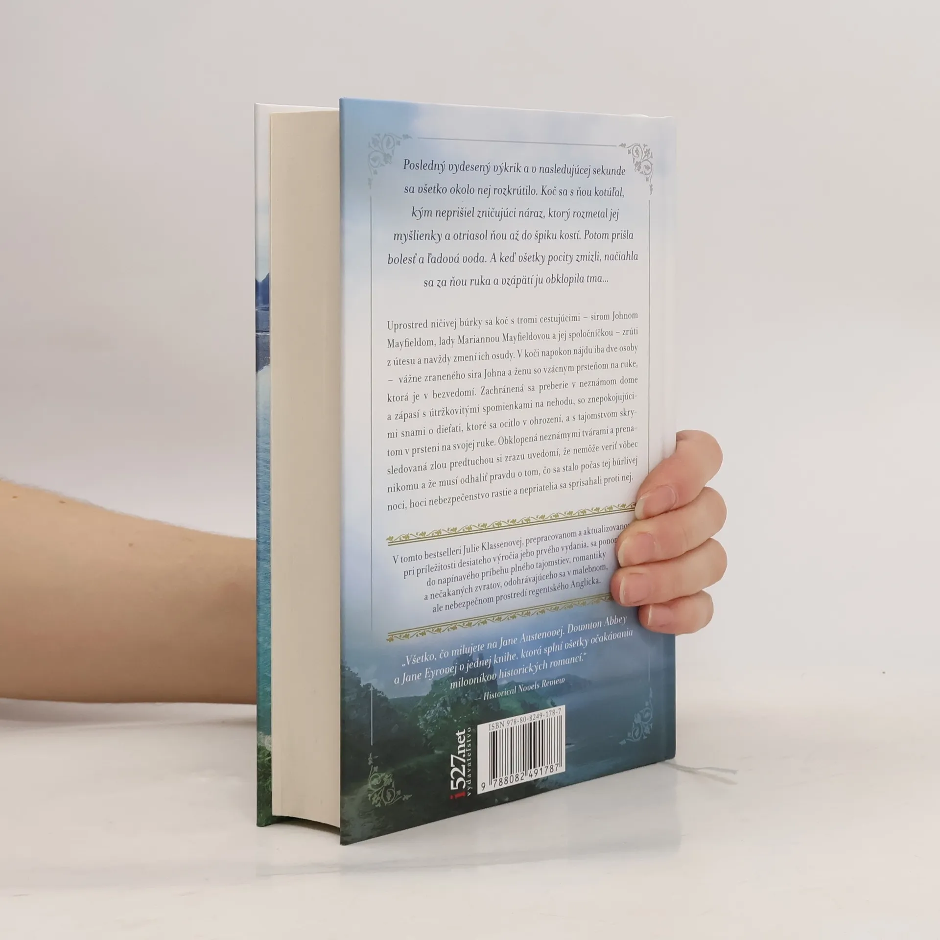Posledný vydesený výkrik a v nasledujúcej sekunde sa všetko okolo nej rozkrútilo. Koč sa s ňou kotúľal, kým neprišiel zničujúci náraz, ktorý rozmetal jej myšlienky a otriasol ňou až do špiku kostí. Potom prišla bolesť a ľadová voda. A keď všetky pocity zmizli, načiahla sa za ňou ruka a vzápätí ju obklopila tma… Uprostred ničivej búrky sa koč s tromi cestujúcimi – sirom Johnom Mayfieldom, lady Mariannou Mayfieldovou a jej spoločníčkou – zrúti z útesu a navždy zmení ich osudy. V koči napokon nájdu iba dve osoby – vážne zraneného sira Johna a ženu so vzácnym prsteňom na ruke, ktorá je v bezvedomí. Zachránená sa preberie v neznámom dome a zápasí s útržkovitými spomienkami na nehodu, so znepokojujúcimi snami o dieťati, ktoré sa ocitlo v ohrození, a s tajomstvom skrytom v prsteni na svojej ruke. Obklopená neznámymi tvárami a prenasledovaná zlou predtuchou si zrazu uvedomí, že nemôže veriť vôbec nikomu a že musí odhaliť pravdu o tom, čo sa stalo počas tej búrlivej noci, hoci nebezpečenstvo rastie a nepriatelia sa sprisahali proti nej.
