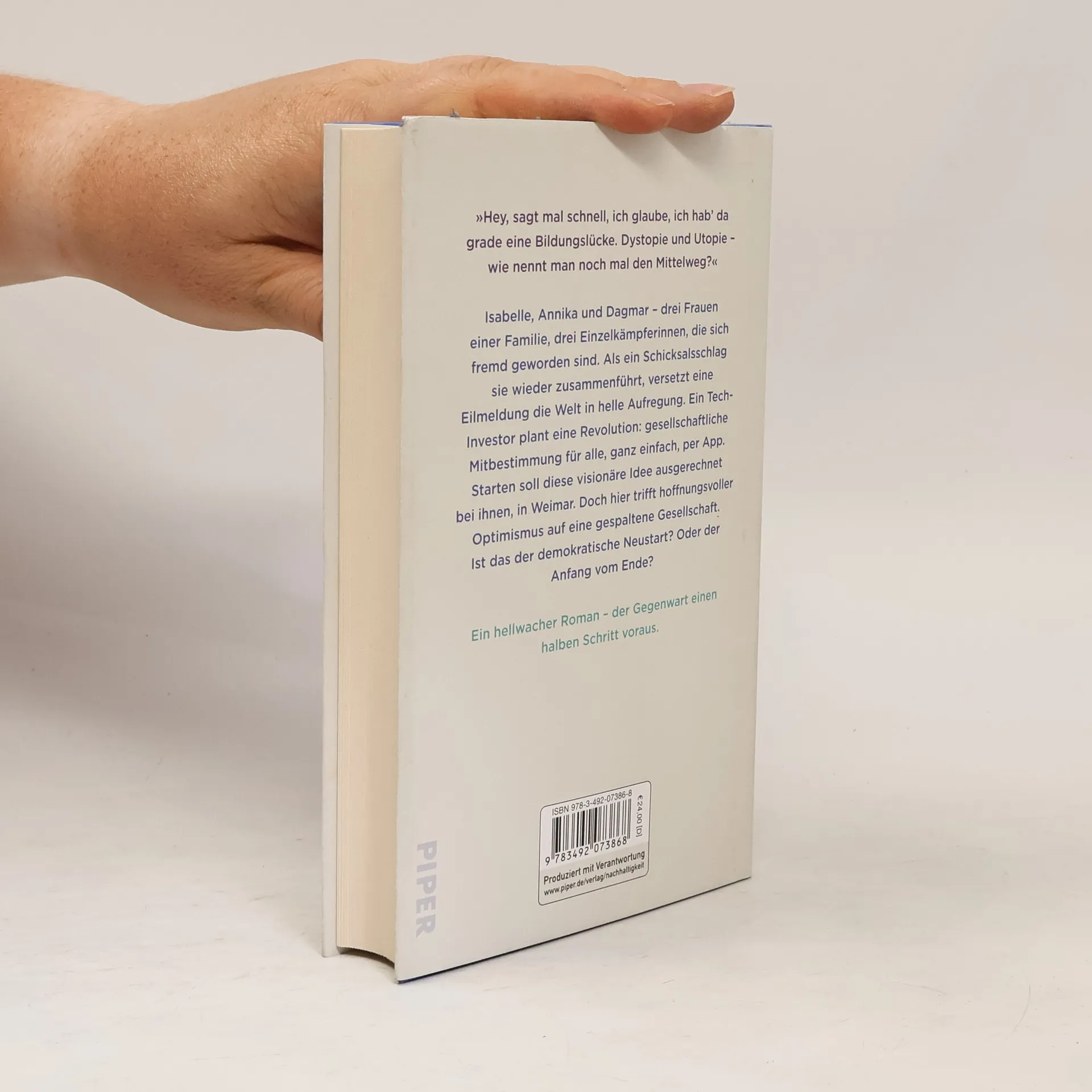 Eine entzweite Familie, ein gespaltenes Land, ein Tech-Milliardär und seine Vision von Gesellschaft Isabelle und Annika haben verlernt, miteinander zu sprechen. Nun, am Sterbebett ihrer Mutter, müssen sie es tun. Auch ihre Tante Dagmar ist da. Drei Frauen, drei Einzelkämpferinnen. Und noch während sie sich an das Gefühl herantasten, als Familie zusammenzugehören, launcht ein internationaler Tech-Milliardär seine Idee einer revolutionär neuen Gemeinschaft. Er will der Gesellschaft ein Update verpassen. Per App. Und alle können sich dabei einbringen. Der Start für das Projekt soll ausgerechnet hier bei ihnen sein: in Weimar. Schon Tage später sind die drei Teil einer öffentlichen Debatte. Denn was da auf sie zukommt, klingt so vielversprechend wie rätselhaft. Ist das der Neustart für die Demokratie? Oder der Anfang vom Ende?