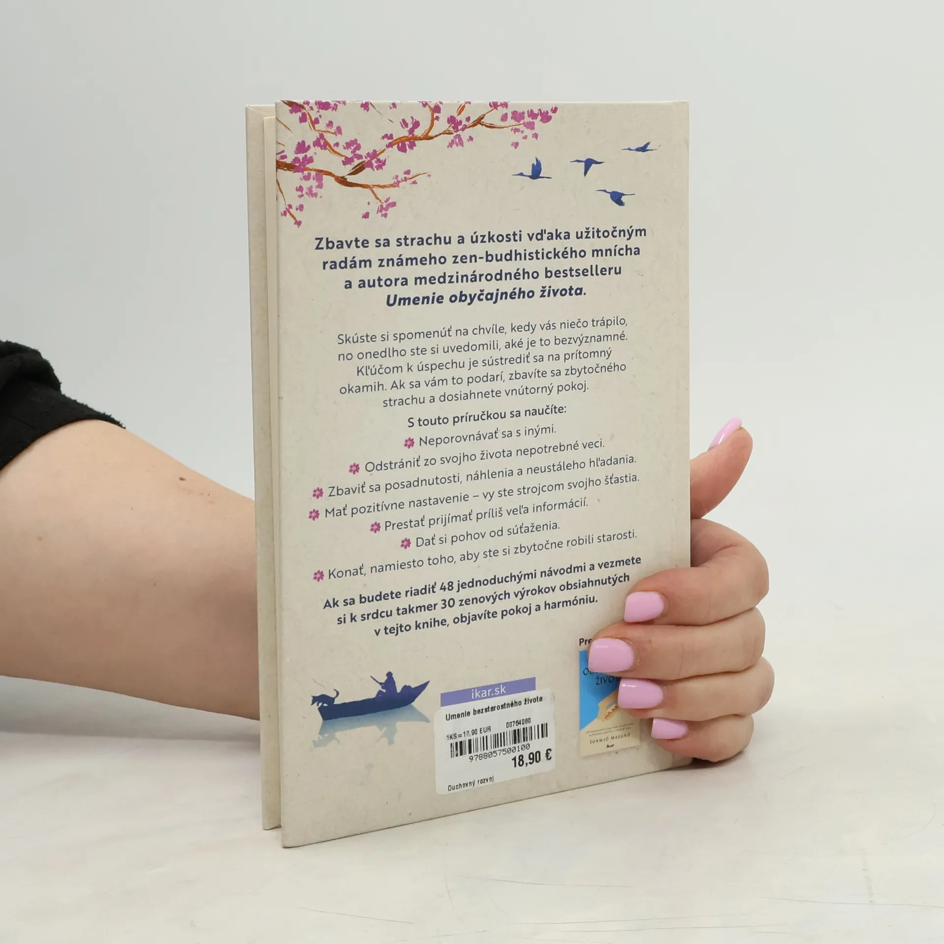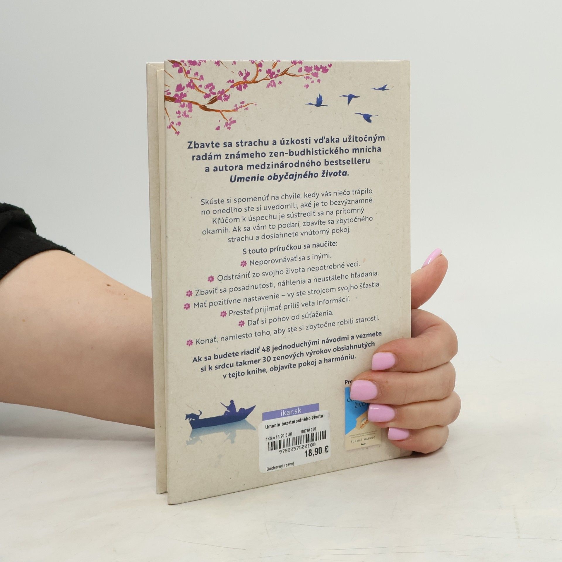 Táto užitočná publikácia od zen-budhistického mnícha, autora medzinárodného bestselleru Umenie obyčajného života, vám pomôže zmierniť úzkostné stavy a znížiť intenzitu stresu, ktoré vás zožierajú, pretože deväťdesiat percent vašich obáv sa nikdy nenaplní. Spomeňte si na obdobie, kedy ste sa pre niečo trápili a zrazu ste si uvedomili, že to bolo úplne nepodstatné a nemalo význam sa tým zožierať. Kľúčom k úspechu je sústrediť sa na to, čo sa deje tu a teraz. Ak to dokážete, zbavíte sa zbytočného strachu a napätia. A čo je najdôležitejšie, dosiahnete vnútorný pokoj. Konečne sa naučíte prestať porovnávať s inými a zmiznú vaše nepríjemné vtieravé myšlienky. Odstránite zo svojho života nepotrebné veci a čo najviac si ho zjednodušíte. Zbavíte sa posadnutosti, náhlenia a neustáleho hľadania. Pozitívne sa nastavíte, prestanete so všetkými súťažiť a prijímať príliš veľa informácií. Naučíte sa aktívne konať a nezahlcovať si myseľ zbytočnými starosťami. Ak sa budete riadiť 48 jednoduchými radami a vezmete si k srdcu takmer 30 zenových výrokov obsiahnutých v tejto knihe, objavíte pokoj a harmóniu.