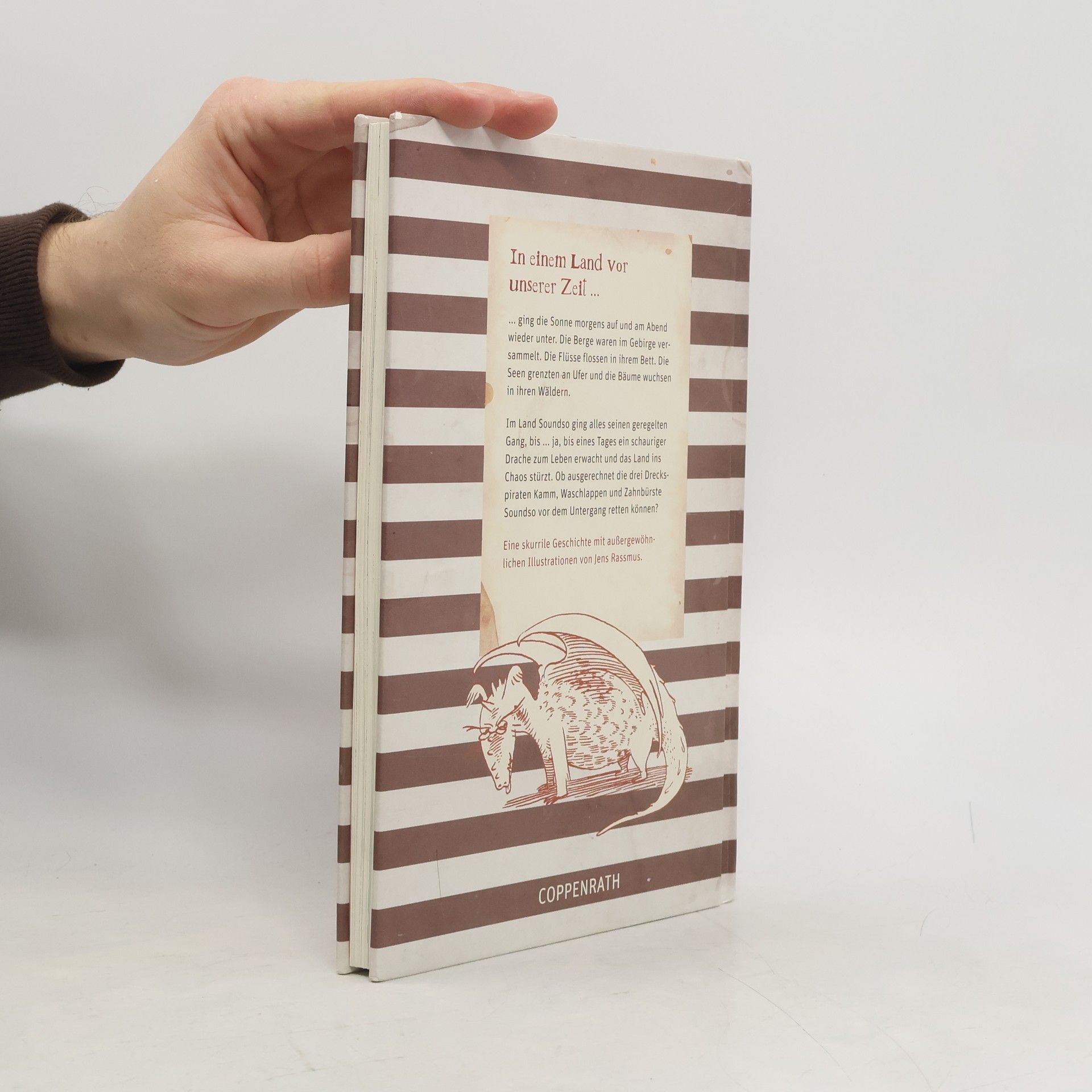 In einem Land vor unserer Zeit ging die Sonne morgens auf und am Abend wieder unter. Die Berge waren im Gebirge versammelt. Die Flüsse flossen in ihrem Bett. Die Seen grenzten an Ufer und die Bäume wuchsen in ihren Wäldern. Denn Soundso war ein sehr ordentliches Land. Alles dort ging seinen geregelten Gang, bis ... ja, bis eines Tages ein schauriger Drache zum Leben erwacht und das Land ins Chaos stürzt. Ob ausgerechnet die drei Dreckspiraten Kamm, Waschlappen und Zahnbürste Soundso vor dem Untergang retten können? - Eine poetisch-skurrile Geschichte mit humorvollen Illustrationen -