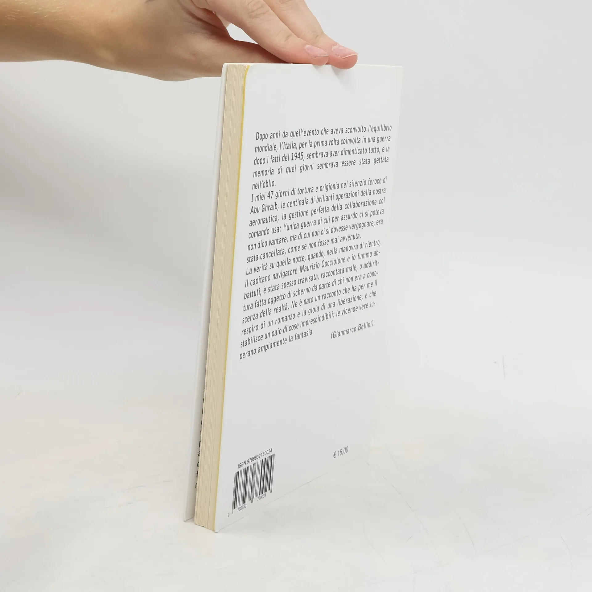 Dopo anni da quell’evento che aveva sconvolto l’equilibrio mondiale, l’Italia, per la prima volta coinvolta in una guerra dopo i fatti del 1945, sembrava aver dimenticato tutto, e la memoria di quei giorni sembrava essere stata gettata nell’oblio.I miei 47 giorni di tortura e prigionia nel silenzio feroce di Abu Ghraib, le centinaia di brillanti operazioni della nostra aeronautica, la gestione perfetta della collaborazione col comando usa: l’unica guerra di cui per assurdo ci si poteva non dico vantare, ma di cui non ci si dovesse vergognare, era stata cancellata, come se non fosse mai avvenuta.La verità su quella notte, quando, nella manovra di rientro, il capitano navigatore Maurizio Cocciolone e io fummo abbattuti, è stata spesso travisata, raccontata male, o addirittura fatta oggetto di scherno da parte di chi non era a conoscenza della realtà. Ne è nato un racconto che ha per me il respiro di un romanzo e la gioia di una liberazione, e che stabilisce un paio di cose imprescindibili: le vicende vere superano ampiamente la fantasia.(Gianmarco Bellini)