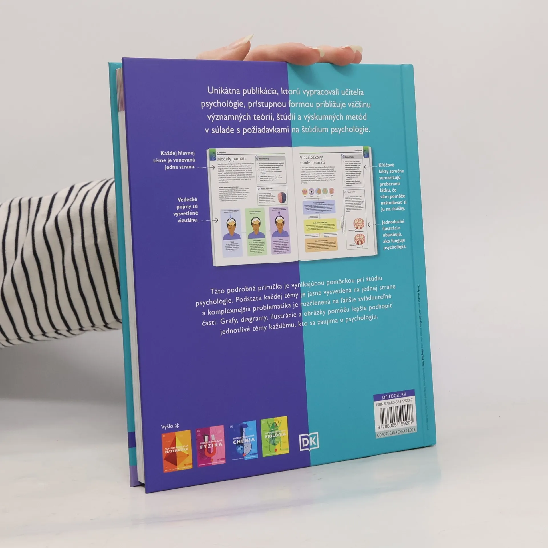 Unikátna publikácia, ktorú vypracovali učitelia psychológie, prístupnou formou približuje väčšinu významných teórií, štúdií a výskumných metód v súlade s požiadavkami na štúdium psychológie.Každá strana sa venuje konkrétnej téme a je zostavená a ilustrovaná tak, aby sa dali informácie ľahko pochopiť, zapamätať a aplikovať. Komplexnejšia problematika je rozčlenená na ľahšie zvládnuteľné časti. Grafy, diagramy, ilustrácie a obrázky pomôžu lepšie porozumieť jednotlivým témam.Táto podrobná a prehľadná príručka je vynikajúcou pomôckou pri štúdiu psychológie.