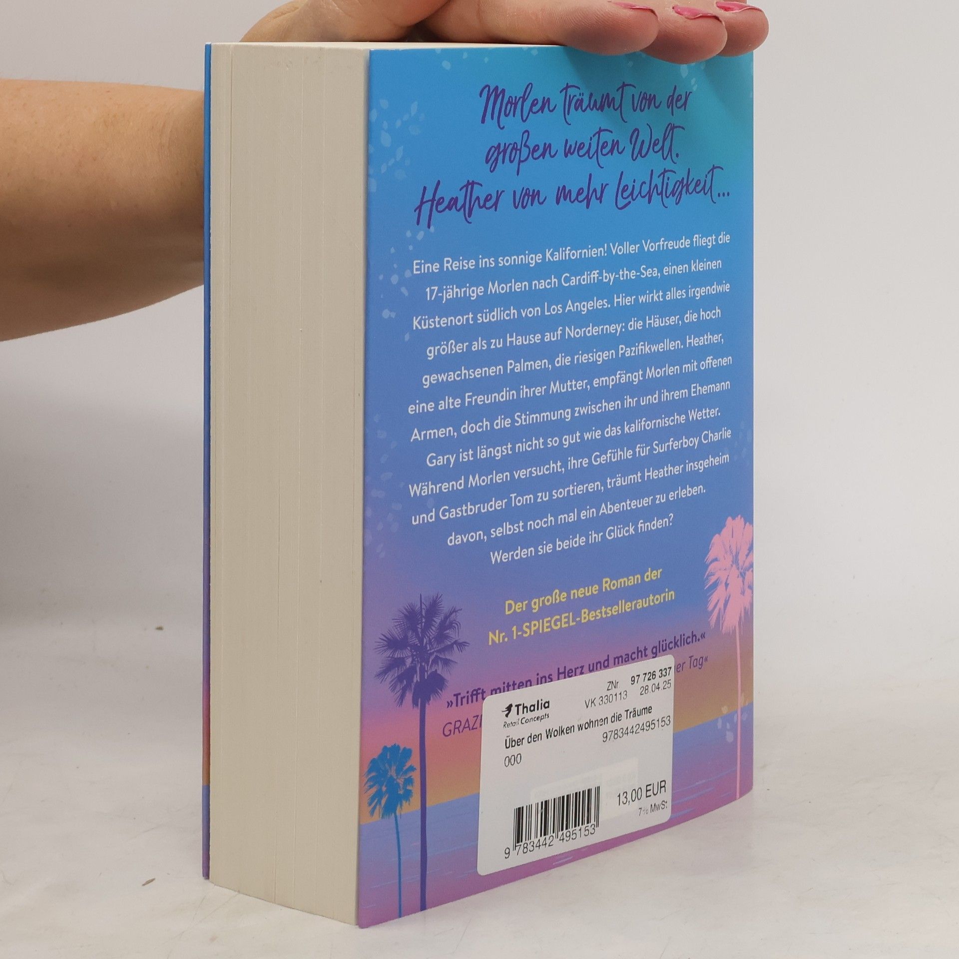 Morlen träumt von der großen weiten Welt. Heather von etwas mehr Leichtigkeit ... Eine Reise ins sonnige Kalifornien! Voller Vorfreude fliegt die 17-jährige Morlen nach Cardiff-by-the-Sea, einen kleinen Küstenort südlich von Los Angeles. Hier wirkt alles irgendwie größer als zu Hause auf Norderney: die Häuser, die hoch gewachsenen Palmen, die riesigen Pazifikwellen. Heather, eine alte Freundin ihrer Mutter, empfängt sie mit offenen Armen, doch die Stimmung zwischen ihr und ihrem Ehemann Gary ist längst nicht so gut wie das kalifornische Wetter. Während Morlen versucht, ihre Gefühle für Surferboy Charlie und Gastbruder Tom zu sortieren, träumt Heather insgeheim davon, selbst noch mal ein Abenteuer zu erleben. Werden sie beide ihr Glück finden? Der große neue Sommerroman der Nr. 1-SPIEGEL-Bestsellerautorin – mit liebevoll illustriertem farbigen Anhang. Pressestimmen zu Meike Werkmeister und ihren Romanen: »Meike Werkmeisters Geschichten machen einfach glücklich.« Karla Paul »Sie ist wie ihre Bücher: witzig, sympathisch und klug.« NDR 90,3 Kulturjournal »Familie, Liebe, Meergefühl und Strandkorb-Feeling – das erzählt keine schöner als Meike Werkmeister!« emotion »Die perfekte Sommerlektüre, um abzuschalten und sich unterhalten zu lassen.« bellestristik-couch.de »Ein Roman wie eine beste Freundin, den man fest in sein Herz schließt.« Feel Good Magazin »Trifft mitten ins Herz und macht glücklich.« Grazia »Ein Roman, der uns zeigt, dass wir uns trauen sollten, auf unser Herz zu hören.« JOY