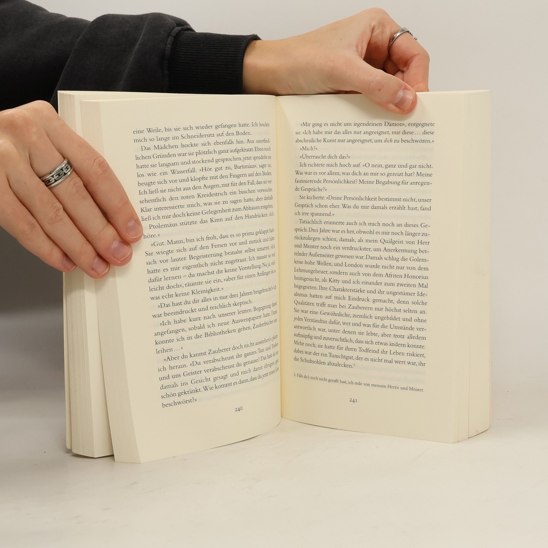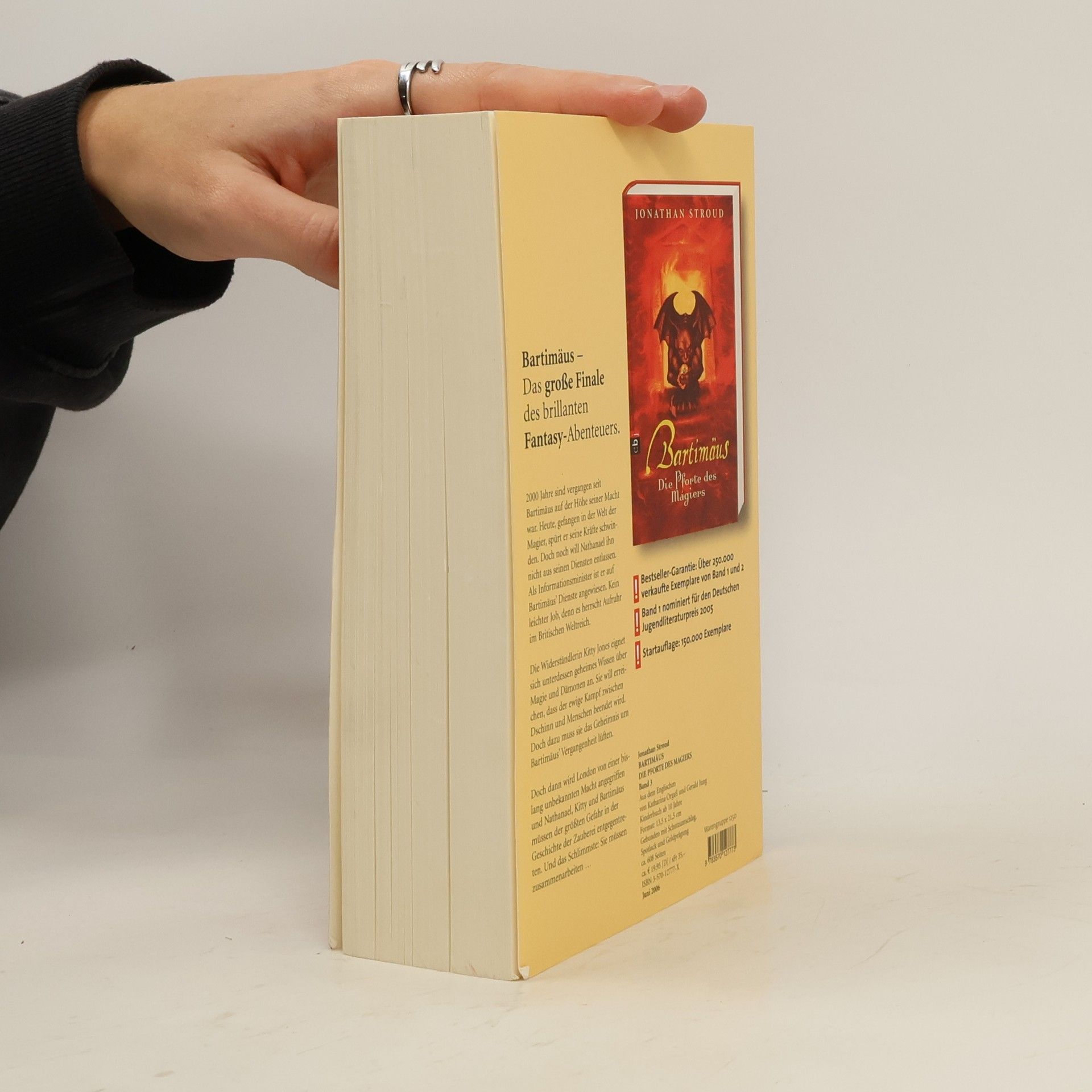 Bartimäus – Das große Finale des brillanten Fantasy-Abenteuers. 2000 Jahre sind vergangen, seit Bartimäus auf der Höhe seiner Macht war. Heute, gefangen in der Welt der Magier, spürt er seine Kräfte schwinden. Doch noch will Nathanael ihn nicht aus seinen Diensten entlassen. Als Informationsminister ist er auf Bartimäus’ Dienste angewiesen. Kein leichter Job, denn es herrscht Aufruhr im britischen Weltreich. Die Widerständlerin Kitty Jones eignet sich unterdessen geheimes Wissen über Magie und Dämonen an. Sie will erreichen, dass der ewige Kampf zwischen Dschinn und Menschen beendet wird. Doch dazu muss sie das Geheimnis um Bartimäus’ Vergangenheit lüften. Doch dann wird London von einer bislang unbekannten Macht angegriffen und Nathanael, Kitty und Bartimäus müssen der größten Gefahr in der Geschichte der Zauberei entgegentreten. Und das Schlimmste: Sie müssen zusammenarbeiten … Band 1 nominiert für den Deutschen Jugendliteraturpreis 2005