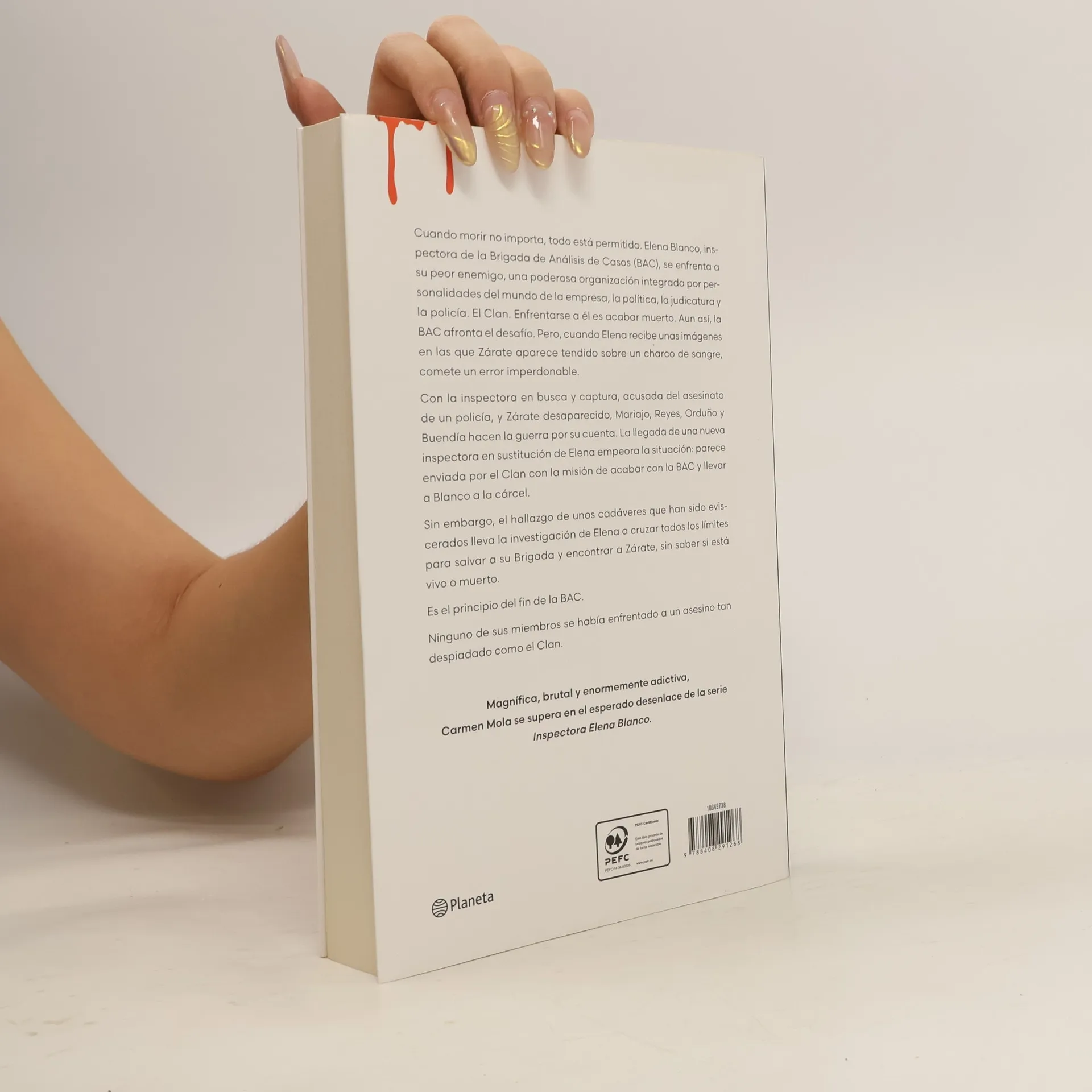 CUANDO MORIR NO IMPORTA, TODO ESTÁ PERMITIDO. EL BRUTAL DESENLACE DE LA SERIE INSPECTORA ELENA BLANCOElena Blanco, inspectora de la Brigada de Análisis de Casos (BAC) se enfrenta a su peor enemigo, una poderosa organización integrada por personalidades del mundo de la empresa, la política, la judicatura y la policía. El Clan. Enfrentarse a él es acabar muerto. Aun así, la BAC afronta el desafío. Pero cuando Elena recibe unas imágenes en las que Zárate aparece tendido sobre un charco de sangre, comete un error imperdonable. Con la inspectora en busca y captura, acusada del asesinato de un policía, y Zárate desaparecido, Mariajo, Reyes, Orduño y Buendía hacen la guerra por su cuenta. La llegada de una nueva inspectora en sustitución de Elena empeora la situació parece enviada por el Clan con la misión de acabar con la BAC y llevar a Blanco a la cárcel. Sin embargo, el hallazgo de unos cadáveres que han sido eviscerados lleva la investigación de Elena a cruzar todos los límites para salvar a su Brigada y encontrar a Zárate, sin saber si está vivo o muerto. Es el principio del fin de la BAC. Ninguno de sus miembros se había enfrentado a un asesino tan despiadado como el Clan.Magnífica, brutal y enormemente adictiva, Carmen Mola se supera en el esperado desenlace de la serie Inspectora Elena Blanco.