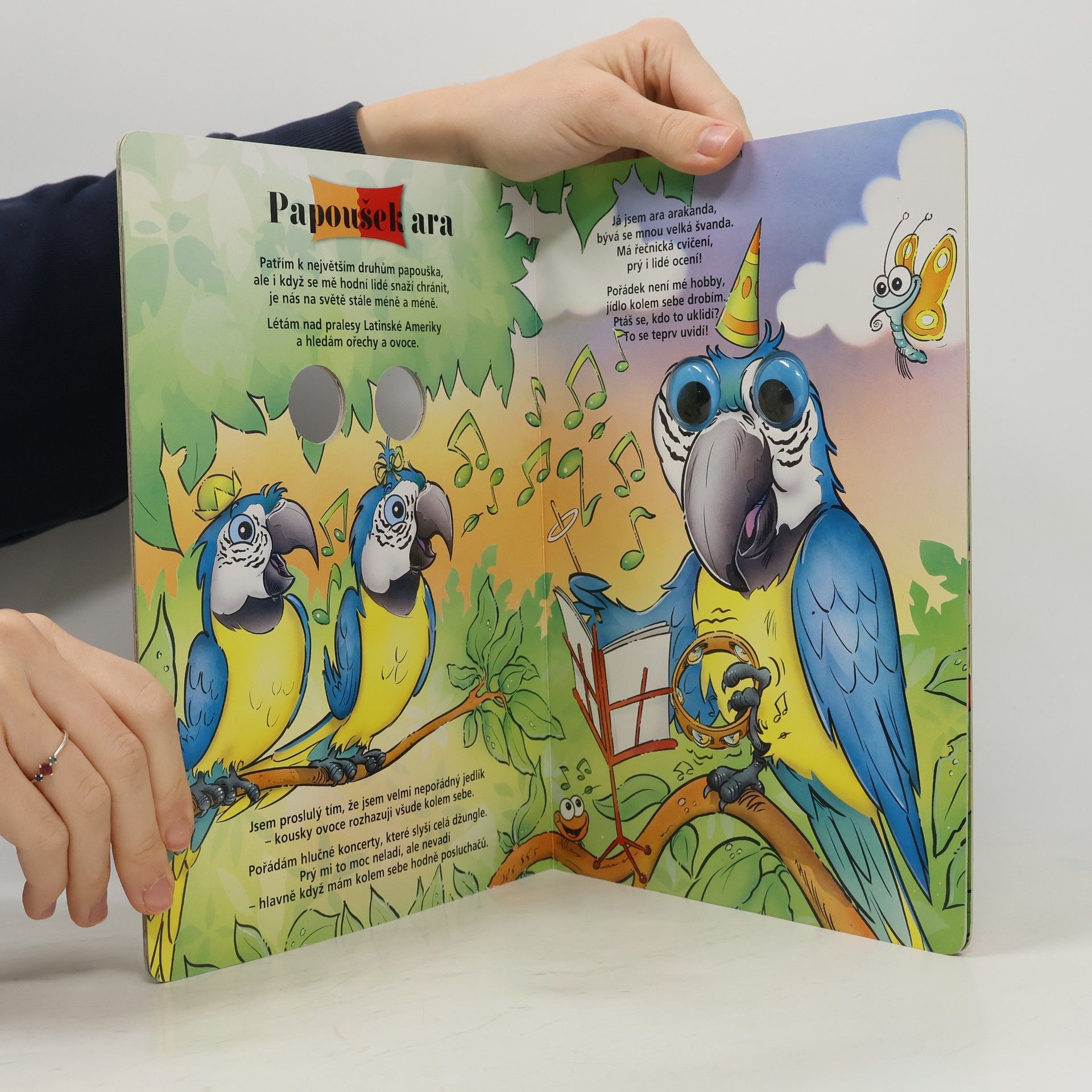 Toto leporelo vám představí cizokrajné ptactvo. Tukan, papoušek Ara, kolibřík – o každém se v této knížce dozvíte. Jak daleko létají, jaký mají zobák, čím se živí a kde žijí. S touto knihou zažijete i mnoho zábavy – ptáčci mají plastové oči s pohyblivými panenkami.