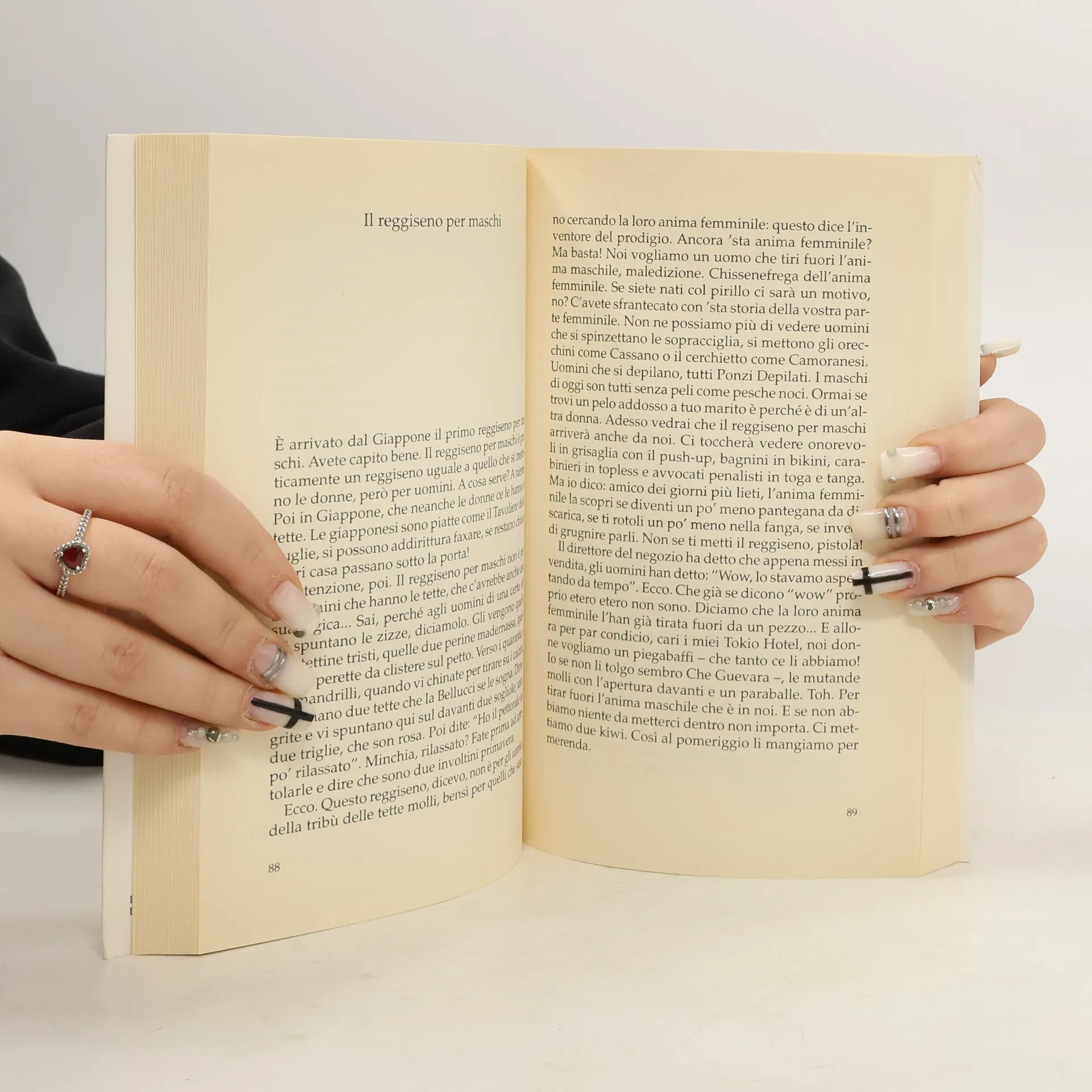 "Per noi la jolanda è un oggetto d'uso. Ci basta che funzioni bene e fine. Per i maschi, invece, il walter è come l'automobile: uno status symbol. Allora ecco che inventano la pomata che lo fa risvegliare di colpo: da spinacio a zucchina in un nanosecondo. E per te maschio che soffri di caduta libera, che hai il walter che fa bungee-jumping, c'è la calamita che te lo tira su come il ponte levatoio dei castelli. Senti anche il rumore: sradadadadan... E poi c'avete sfrantecato con 'sta storia del vostro lato femminile. Non ne possiamo più di vedere uomini che si depilano, tutti Ponzi Depilati. I maschi di oggi son tutti senza peli come pesche noci. Ormai se trovi un pelo addosso a tuo marito è perché è di un'altra donna. Tanto le carte in tavola non cambiano: noi donne siamo la spuma dello champagne mentre voi maschi non siete altro che il fondo sabbioso del barbera. A voi appena vedete una jolanda vi si accende un neon nel cervello che lampeggia, gnoc-ca gnoc-ca gnoc-ca, come le luci di emergenza. Certo, anche noi donne abbiamo i nostri sporchi trucchi. Tipo il Verginity soap, un sapone che serve a ricostruire la verginità. Se prima della insaponata la vostra jolanda era una autostrada a quattro corsie, dopo diventa una mulattiera. Se prima era una saccoccia da grembiule, dopo diventa un'asola. Se prima era una nave scuola, dopo diventa una gondola." Parlare di walter e jolanda è un modo per parlare del mondo. Luciana Littizzetto lo ha capito prima di tutti. Nelle sue irresistibili pagine i nostri organi genitali diventano qualcosa di superiore, quasi metafisico: lo yin e lo yan, i due assi cartesiani dell'universo. E come per magia la comicità si allarga e diventa satira.