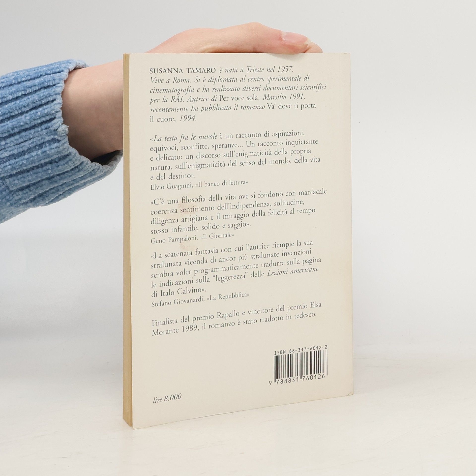 "La scatenata fantasia con cui l'autrice riempie la sua stralunata vicenda di ancor più stralunate invenzioni sembra voler programmaticamente tradurre sulla pagina le indicazioni sulla 'leggerezza' delle Lezioni americane di Italo Calvino." (Stefano Giovanardi). Con La testa fra le nuvole Susanna Tamaro ha vinto il Premio Elsa Morante.