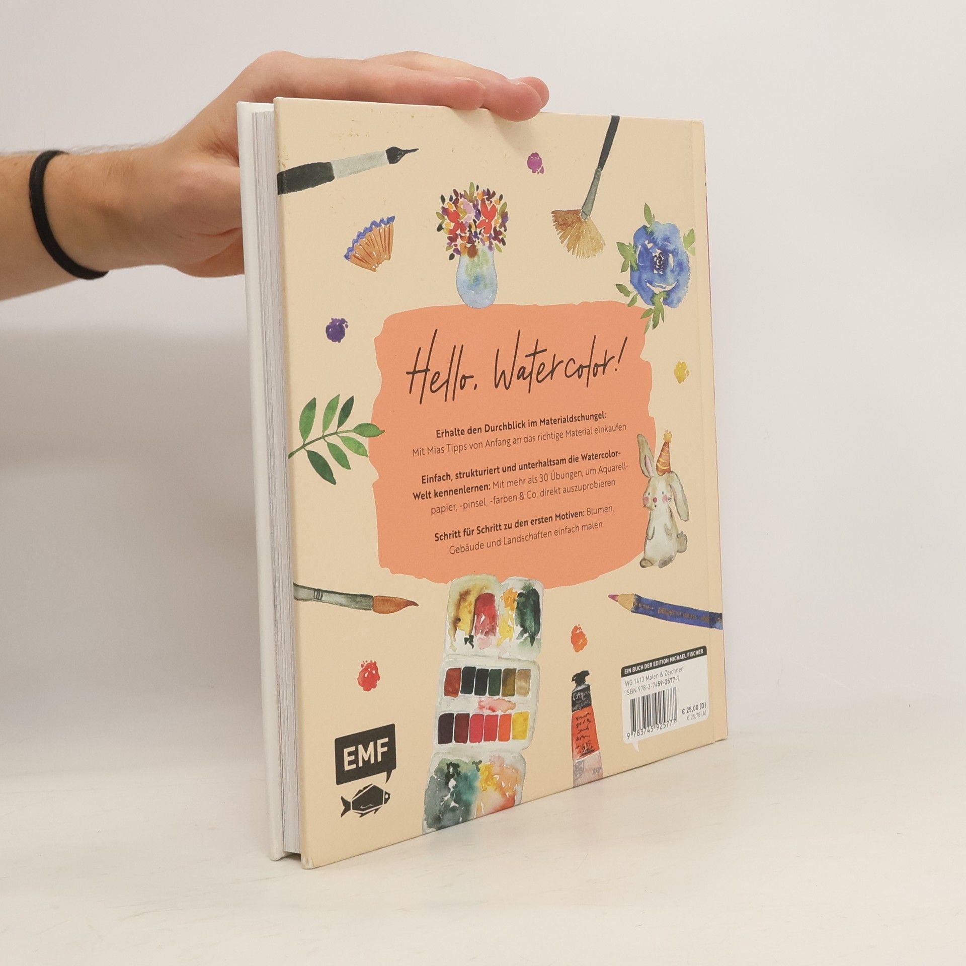 Einfach, strukturiert und unterhaltsam die Watercolor-Welt kennenlernen: Dieses Buch vermittelt dir alles, was du zu Watercolor wissen musst! Welches Aquarellpapier ist für das Malen mit Aquarellfarben am besten geeignet? Welche Farben solltest du auf jeden Fall im Aquarellkasten haben? Und mit welchem Pinsel lassen sich die schönsten Watercolor-Blumen malen? Die Watercolor-Liebhaberin Mia räumt im Materialdschungel auf und stellt dir Papiere, Pinsel und Farben strukturiert und umfassend vor. Mit ihrem Expertinnenwissen, das sie sich durch Betreiben des Online-Shops Stifteliebe.de über viele Jahre angeeignet hat, wirst auch du den Durchblick bekommen und die richtigen Kaufentscheidungen treffen. Zusätzlich zeigt sie dir im Buch alle wichtigen Techniken, die du zum Malen mit Watercolor benötigst. So wirst du direkt zum richtigen Papier und Pinsel greifen, wenn es um das Malen von Landschaften, Gebäuden oder Blumen geht. Und mit mehr als 30 verschiedenen Übungen und Projektanleitungen gehen die erlernten Techniken direkt leichter von der Hand. Auf die Pinsel, fertig, los! Papier, Pinsel, Farben & Co.: Alle Watercolor-Materialien umfassend vorgestellt Erhalte den Durchblick im Materialdschungel: Mit Mias Tipps von Anfang an das richtige Material einkaufen Mit mehr als 30 Übungen und Projekten das theoretische Wissen direkt praktisch anwenden Schritt für Schritt zu den ersten Motiven: Blumen, Gebäude und Landschaften einfach malen Mit Exkursen zu Gouache und Maskierflüssigkeit Wenn man anfängt, sich mit der Aquarellmalerei und Watercolor zu beschäftigen, ploppen gleich auch viele Fragen auf: Welche Pinsel, welche Farben und welches Papier sollte ich kaufen? Welches Material ist ein Muss und was brauche ich erst mal nicht? Wie sollte das Verhältnis von Wasser und Farbe aussehen, damit mein Bild schön wird? Mia widmet sich in ihrem Buch all diesen Themen und kann dir mit ihren Tipps, Infos und Empfehlungen eine gute Orientierung für die ersten Erfahrungen mit dem Medium Watercolor geben. Aber auch für Fortgeschrittene hält das Buch einige wissenswerte Infos bereit. So können die eigenen Watercolor-Kenntnisse einfach erweitert werden. Mit ihrer humorvollen Art bringt dir Mia die Watercolor-Welt näher. Kurzweilige Übungen und wunderschöne Projekte begleiten die theoretischen Inhalte, sodass man direkt selbst den Pinsel in die Hand nehmen und die vermittelten Techniken praktisch umsetzen kann. Viel Spaß beim Lesen und Malen!