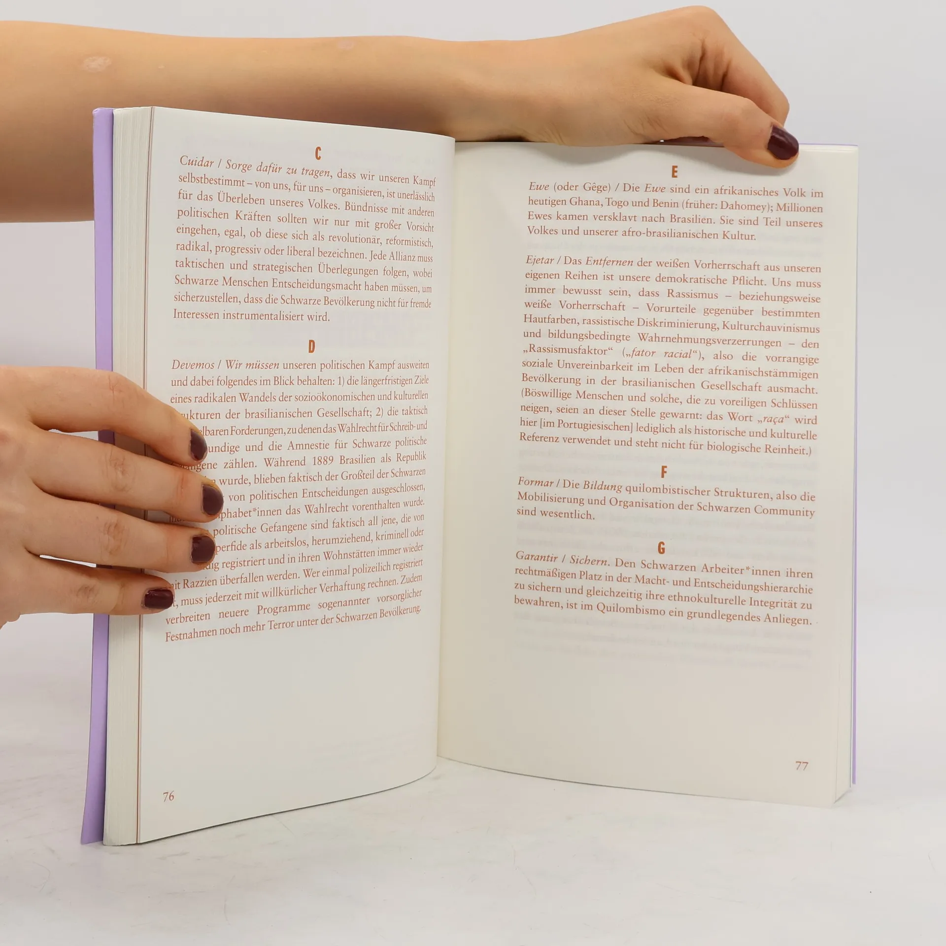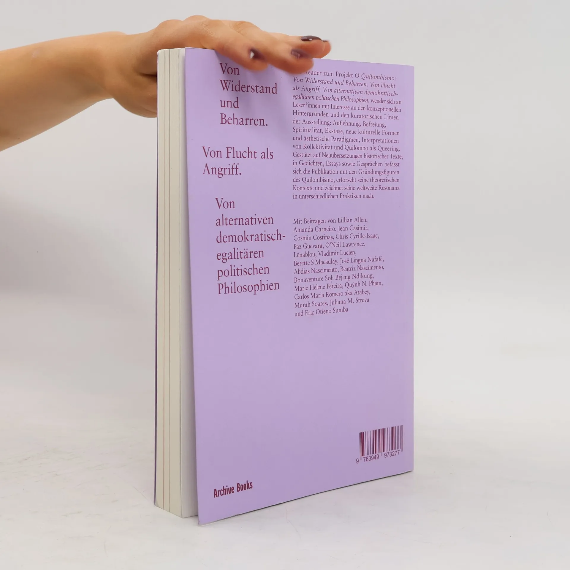 Der Reader zum Projekt O Quilombismo: Von Widerstand und Beharren. Von Flucht als Angriff. Von alternativen demokratisch-egalitären politischen Philosophien, wendet sich an Leser*innen mit Interesse an den konzeptionellen Hintergründen und den kuratorischen Linien der Ausstellung: Auflehnung, Befreiung, Spiritualität, Ekstase, neue kulturelle Formen und ästhetische Paradigmen, Interpretationen von Kollektivität und Quilombo als Queering. Gestützt auf Neuübersetzungen historischer Texte, in Gedichten, Essays sowie Gesprächen befasst sich die Publikation mit den Gründungsfiguren des Quilombismo, erforscht seine theoretischen Kontexte und zeichnet seine weltweite Resonanz in unterschiedlichen Praktiken nach.