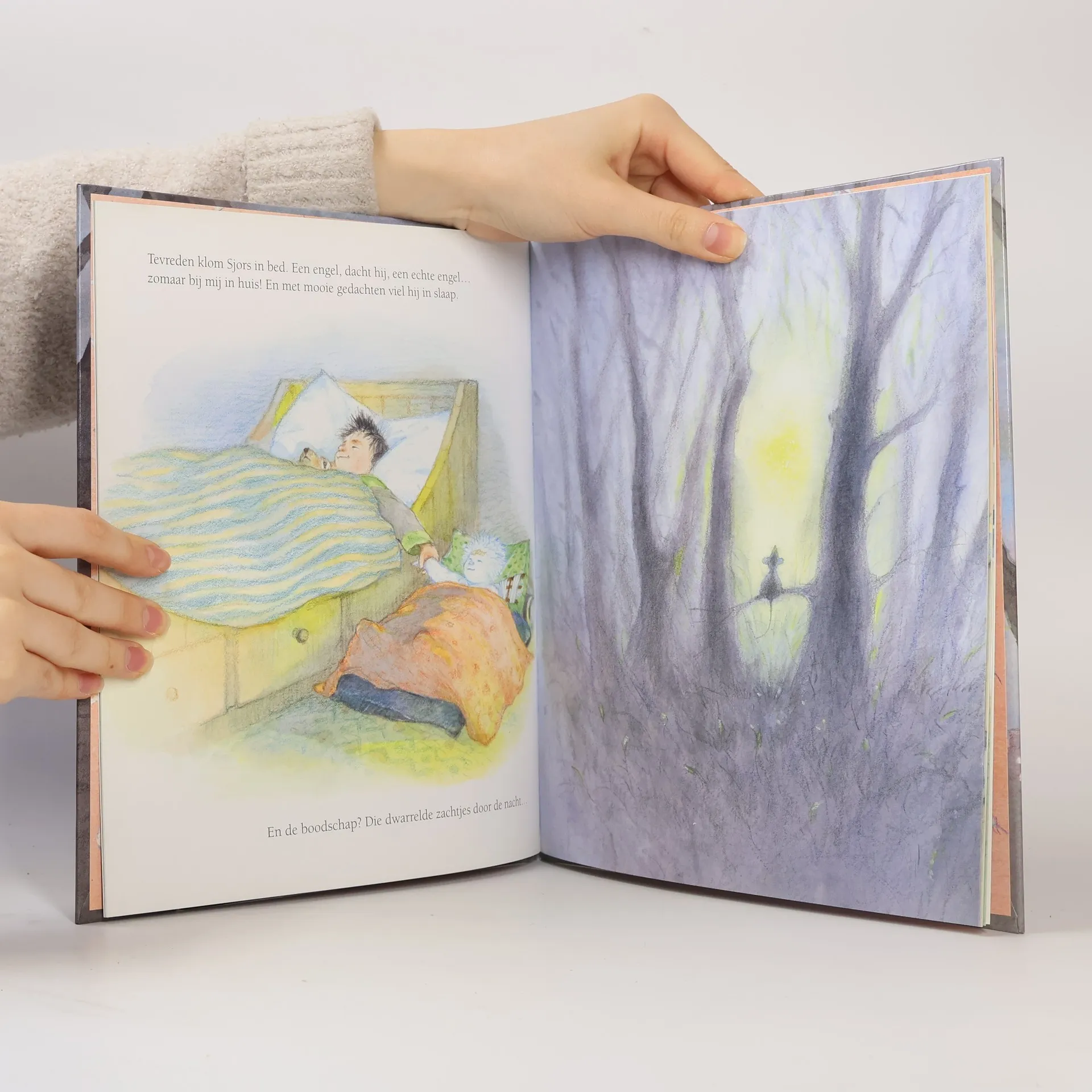Als kleine Sjors een engel helpt, krijgt hij als dank een stukje van haar kerstboodschap van vrede. Prentenboek met warmgekleurde illustraties. Vanaf ca. 4 jaar