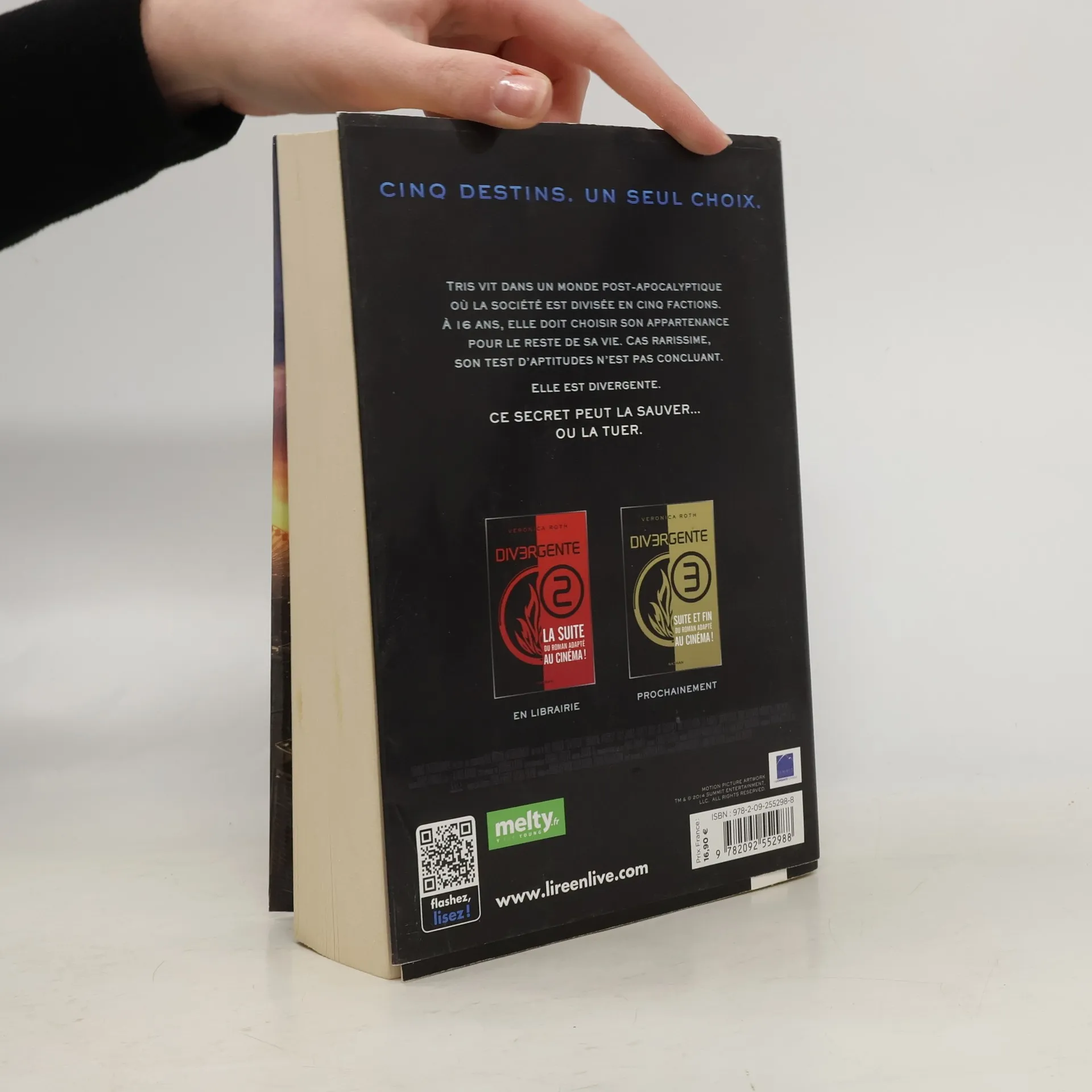 Cinq destins. Un seul choix. Tris vit dans un monde post-apocalyptique où la société est divisée en cinq factions. A 16 ans, elle doit choisir son appartenance pour le reste de sa vie. Cas rarissime, son test d'aptitudes n'est pas concluant. Elle est divergente. Ce secret peut la sauver. Ou la tuer.