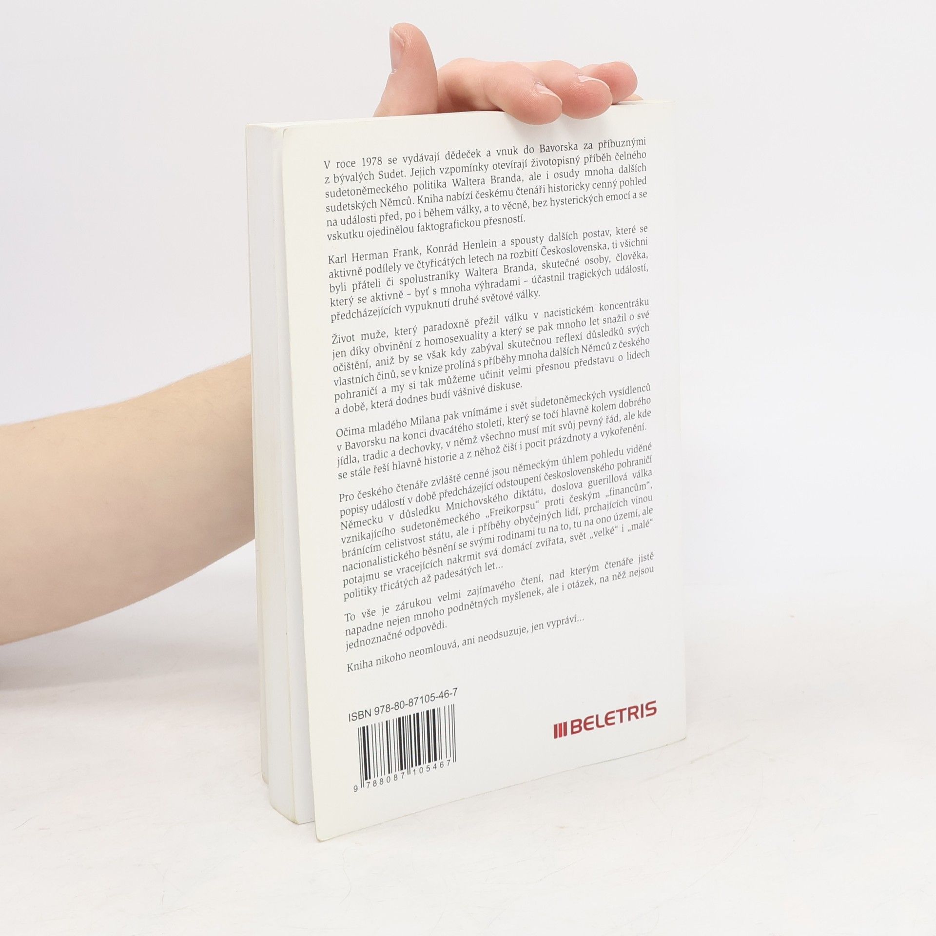 V roce 1978 se dědeček a vnuk vydávají do Bavorska za příbuznými z bývalých Sudet, což otevírá životopisný příběh sudetoněmeckého politika Waltera Branda a osudy dalších sudetských Němců. Kniha poskytuje historicky cenný pohled na události před, po i během války, a to bez hysterických emocí a s výjimečnou faktografickou přesností. Walter Brand byl spojen s osobnostmi jako Karl Herman Frank a Konrád Henlein, kteří se aktivně podíleli na rozbití Československa ve čtyřicátých letech. Jeho život, paradoxně přežívající válku v nacistickém koncentráku díky obvinění z homosexuality, se prolíná s příběhy dalších Němců z českého pohraničí, což čtenáři umožňuje získat přesnou představu o této problematické době. Očima mladého Milana se také díváme na svět sudetoněmeckých vysídlenců v Bavorsku na konci dvacátého století, zaměřený na tradice a dobré jídlo, ale zároveň prosycený pocitem prázdnoty a vykořenění. Zvláště cenné jsou popisy událostí před odstoupením československého pohraničí Německu v důsledku Mnichovského diktátu, včetně guerillové války sudetoněmeckého „Freikorpsu“ proti českým „financům“ a příběhů obyčejných lidí prchajících před nacionalistickým běsněním.