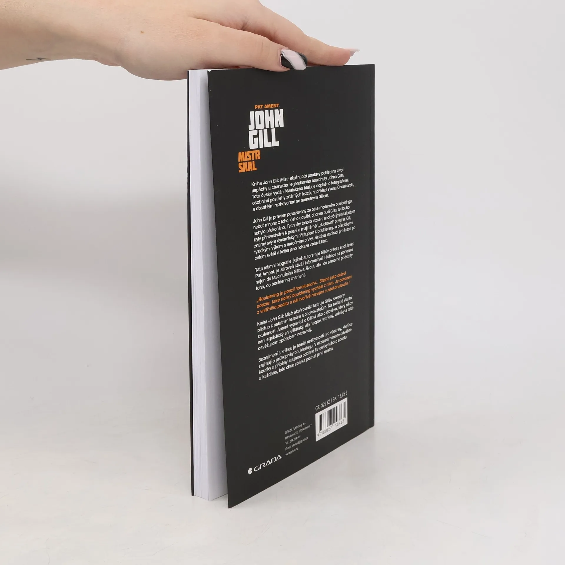 John Gill je právem považovaný za otce moderního boulderingu, neboť mnohé z toho, čeho dosáhl, dodnes budí úžas a dlouho nebylo překonáno. Techniky tohoto lezce s neobyčejným talentem byly přirovnávány k poezii a mají téměř „duchovní“ povahu. Gill, známý svým dynamickým přístupem k boulderingu a působivými fyzickými výkony s náročnými prvky, zůstává inspirací pro lezce po celém světě a kniha jeho odkazu vzdává hold. Tato intimní biografie, jejímž autorem je Gillův přítel a spolulezec Pat Ament, je zároveň čtivá i informativní. Hluboce se ponořuje nejen do fascinujícího Gillova života, ale i do samotné podstaty toho, co bouldering znamená. Tato intimní biografie, jejímž autorem je Gillův přítel a spolulezec Pat Ament, je zároveň čtivá i informativní. Hluboce se ponořuje nejen do fascinujícího Gillova života, ale i do samotné podstaty toho, co bouldering znamená. Kniha John Gill: Master of Rock rovněž ilustruje Gillův skromný přístup k ostatním lezcům a obdivovatelům. Na základě vlastní zkušenosti Ament vypovídá o Gillovi jako o člověku, který nikdy není egoistický ani elitářský, ale naopak vstřícný, vášnivý a také osvěžujícím způsobem nezávislý. Seznámení s knihou je téměř nezbytností pro všechny, kteří se zajímají o průkopníky boulderingu. V ní zaznamenané odvážné kousky a příběhy zaujmou oddané fanoušky tohoto sportu a každého, kdo chce zblízka poznat jeho mistra.