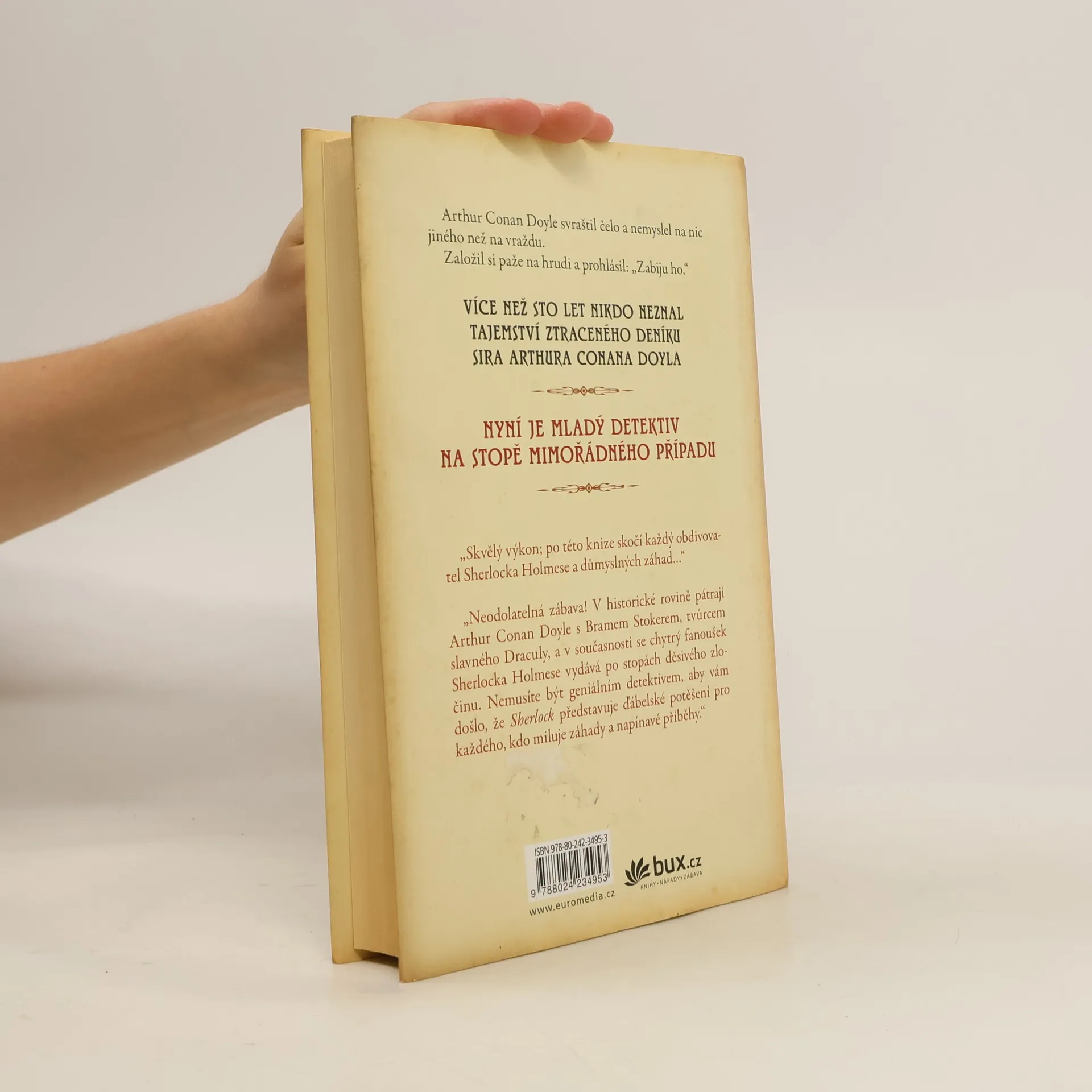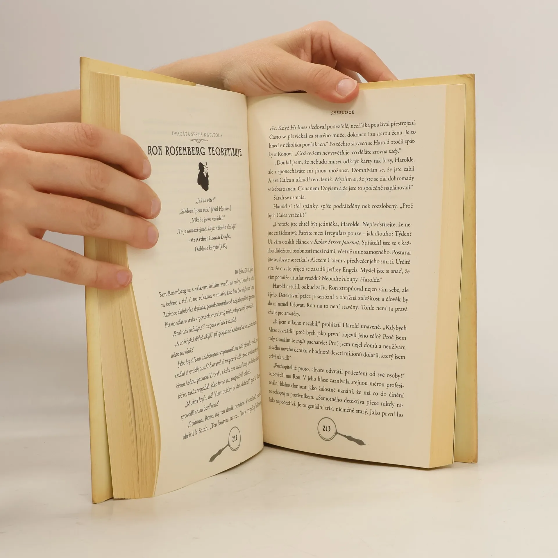 Hrdinou historické roviny románu, který už si získal velký mezinárodní úspěch je sir Arthur Conan Doyle - známý tvůrce postavy slavného detektiva Sherlocka Holmese. Okolnosti ho přivedly k vyšetřování série neobjasněných vražd; při pátrání mu pomáhá jeho přítel Bram Stoker (známý svým dílem Dracula). V současné dějové rovině pátrá mladý literární badatel Harold po vrahovi významného sběratele, který přijel na setkání členů holmesovské společnosti do New Yorku. Napínavý a svěží příběh!