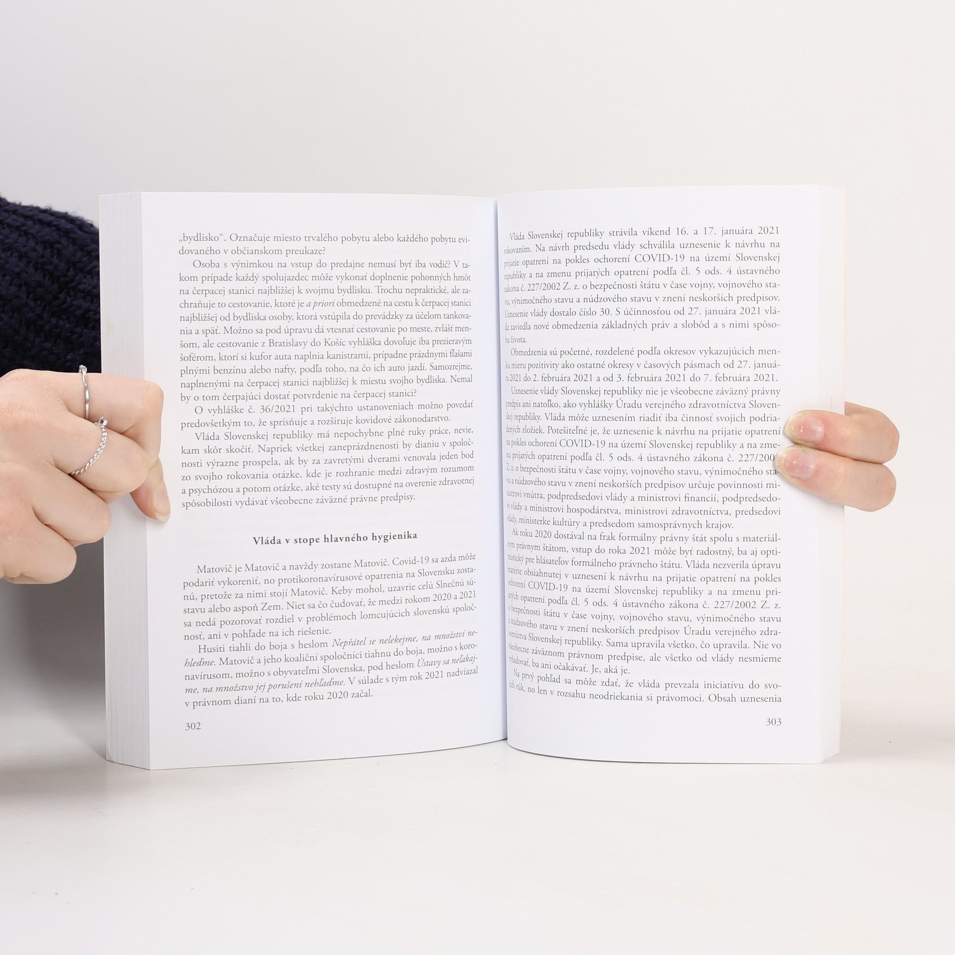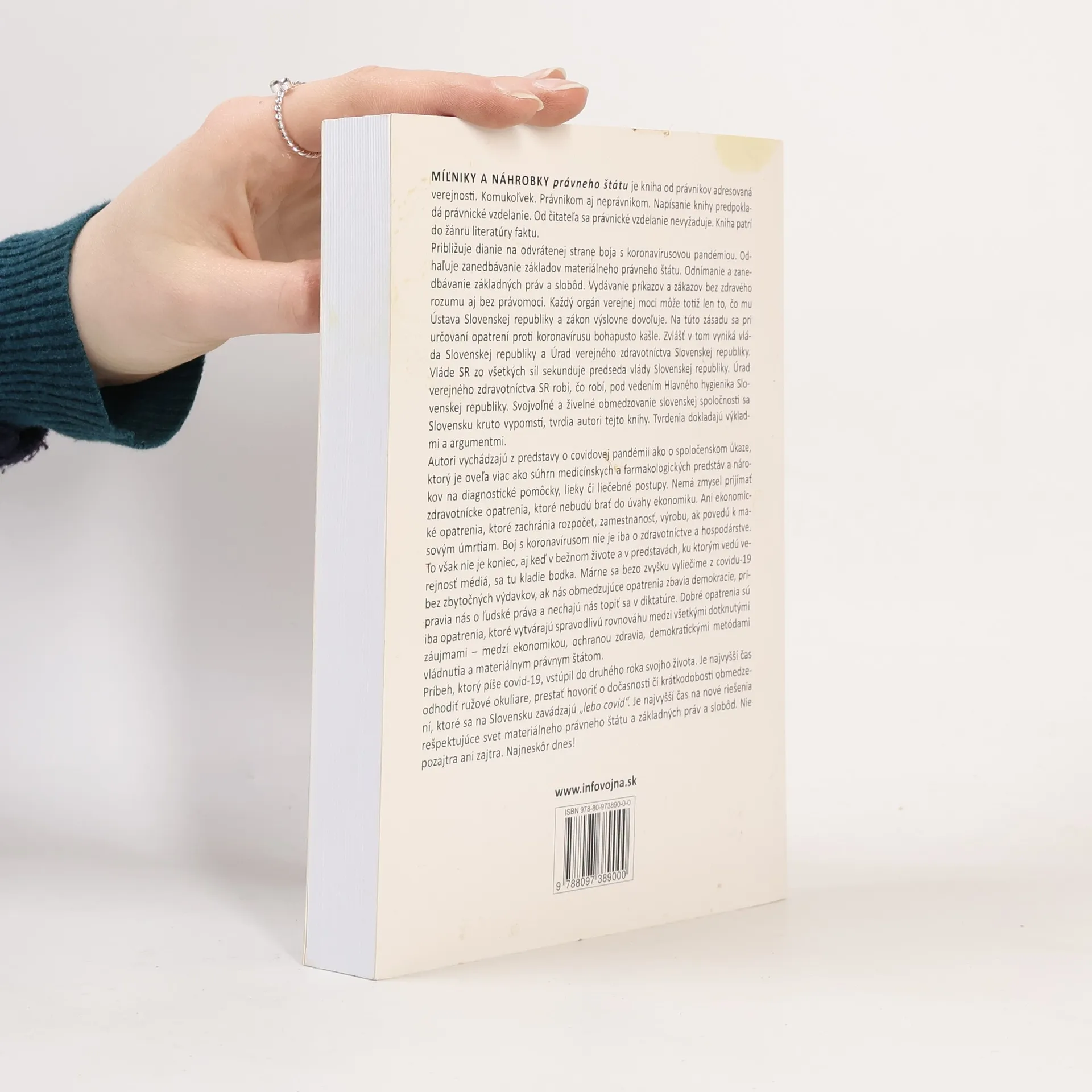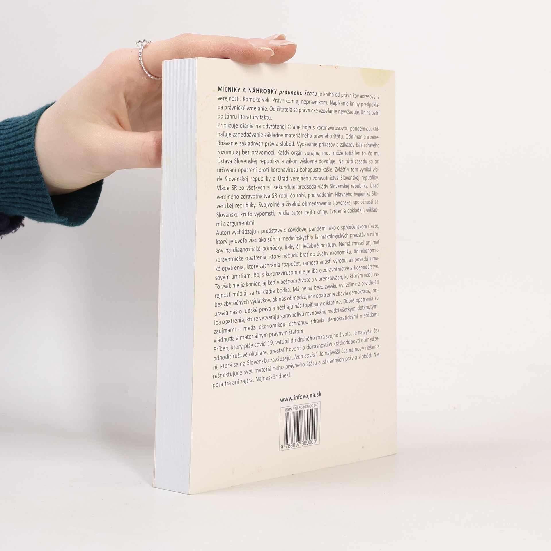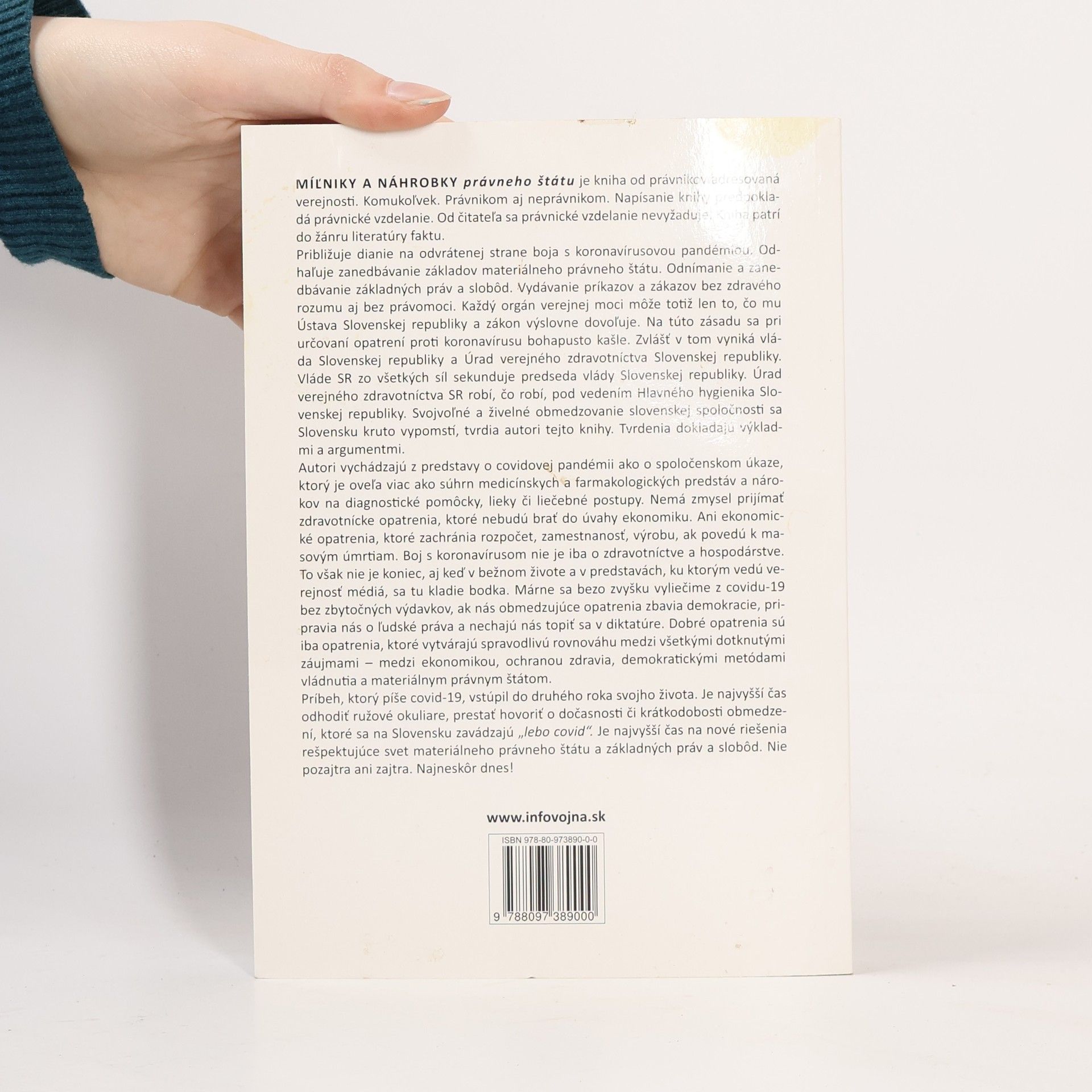 Kniha od právnikov, určená širokej verejnosti, sa zaoberá odvrátenou stranou boja s koronavírusovou pandémiou a odhaľuje zanedbávanie základov právneho štátu. Autori upozorňujú na odnímanie základných práv a slobôd a na vydávanie príkazov bez právomoci a zdravého rozumu. Vláda a Úrad verejného zdravotníctva Slovenskej republiky porušujú ústavné zásady pri určovaní opatrení proti koronavírusu, čo môže mať vážne následky pre spoločnosť. Kniha tvrdí, že boj s pandémiou nie je len otázkou zdravotnej starostlivosti, ale aj ekonomiky a demokracie. Zdravotnícke opatrenia musia zohľadňovať ekonomické dopady, inak môžu viesť k masovým úmrtiam. Autori varujú, že obmedzujúce opatrenia môžu ohroziť demokraciu a ľudské práva, a preto je potrebné hľadať spravodlivú rovnováhu medzi ochranou zdravia, ekonomikou a demokratickými metódami vládnutia. Kniha vyzýva na urgentné riešenia, ktoré rešpektujú materiálny právny štát a základné práva, a to bez odkladu. Je potrebné prestať s ilúziami o dočasnosti obmedzení a konať už dnes.