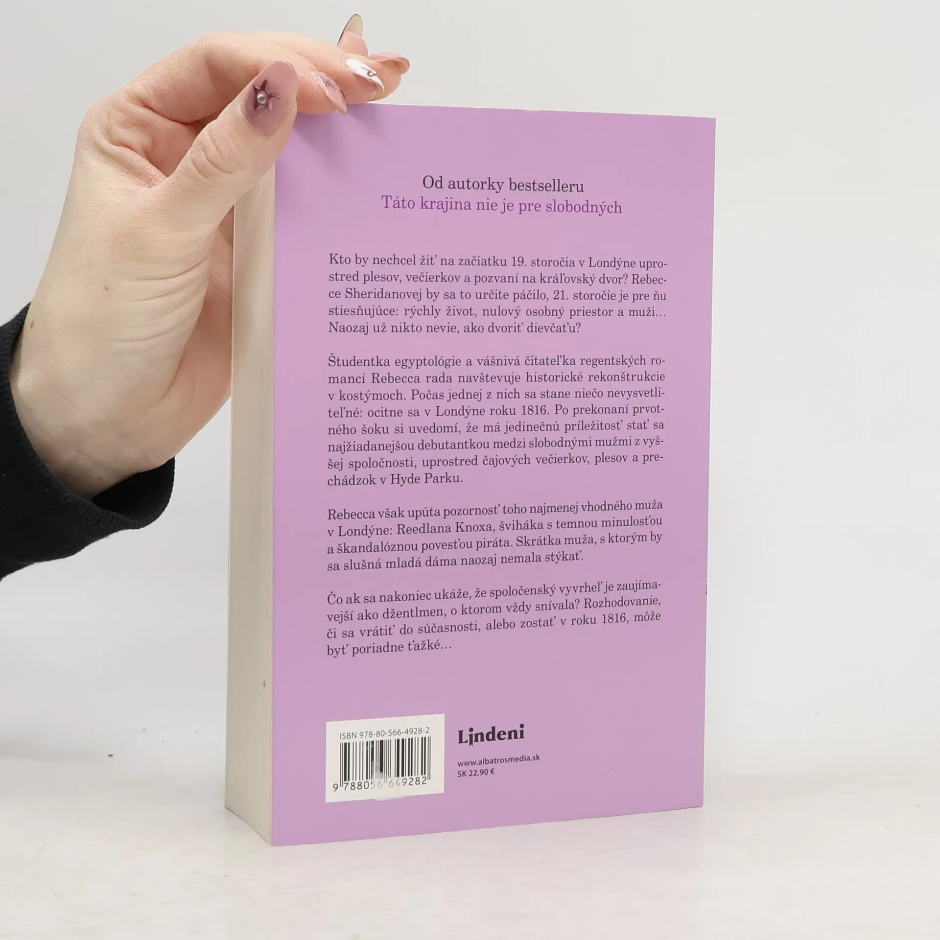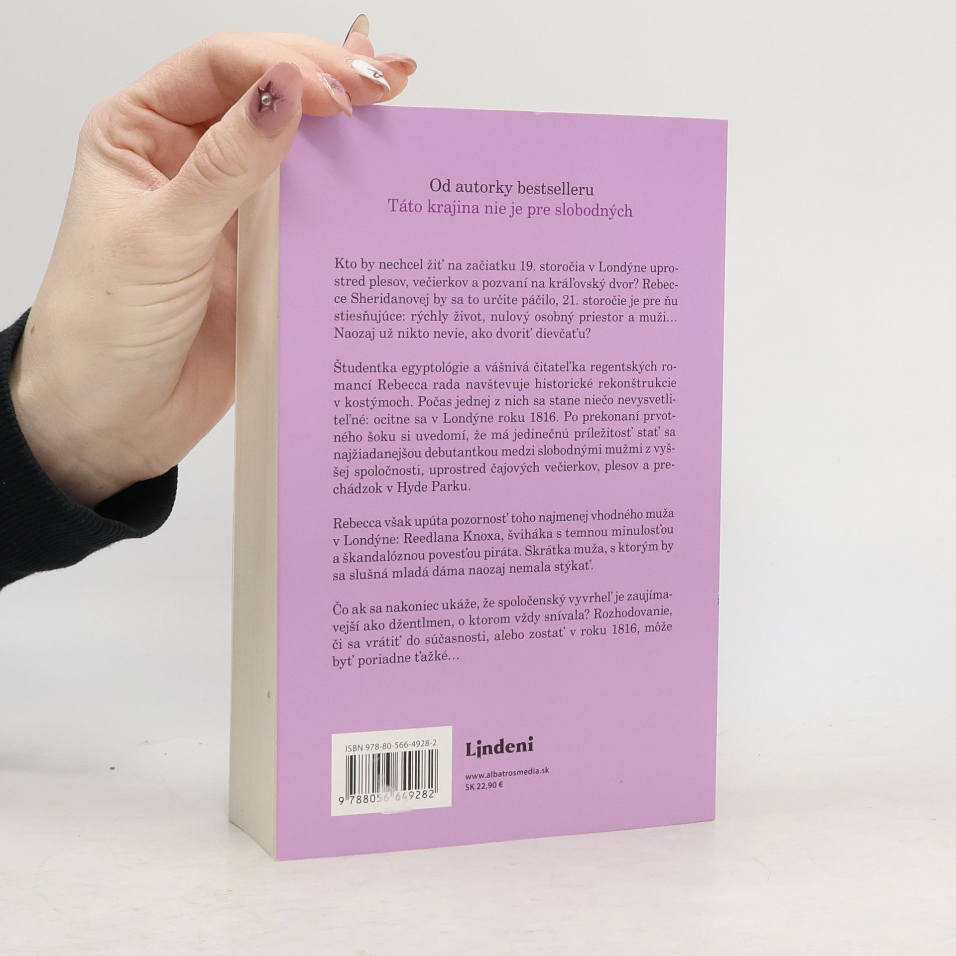 Kto by nechcel žiť na začiatku 19. storočia v Londýne uprostred plesov, večierkov a pozvaní na kráľovský dvor? Rebecce Sheridanovej by sa to určite páčilo, 21. storočie je pre ňu stiesňujúce: rýchly život, nulový osobný priestor a muži… Naozaj už nikto nevie, ako dvoriť dievčaťu? Študentka egyptológie a vášnivá čitateľka regentských romancí Rebecca rada navštevuje historické rekonštrukcie v kostýmoch. Počas jednej z nich sa stane niečo nevysvetliteľné: ocitne sa v Londýne roku 1816. Po prekonaní prvotného šoku si uvedomí, že má jedinečnú príležitosť stať sa najžiadanejšou debutantkou medzi slobodnými mužmi z vyššej spoločnosti, uprostred čajových večierkov, plesov a prechádzok v Hyde Parku. Rebecca však upúta pozornosť toho najmenej vhodného muža v Londýne: Reedlana Knoxa, šviháka s temnou minulosťou a škandalóznou povesťou piráta. Skrátka muža, s ktorým by sa slušná mladá dáma naozaj nemala stýkať. Čo ak sa nakoniec ukáže, že spoločenský vyvrheľ je zaujímavejší ako džentlmen, o ktorom vždy snívala? Rozhodovanie, či sa vrátiť do súčasnosti, alebo zostať v roku 1816, môže byť poriadne ťažké…