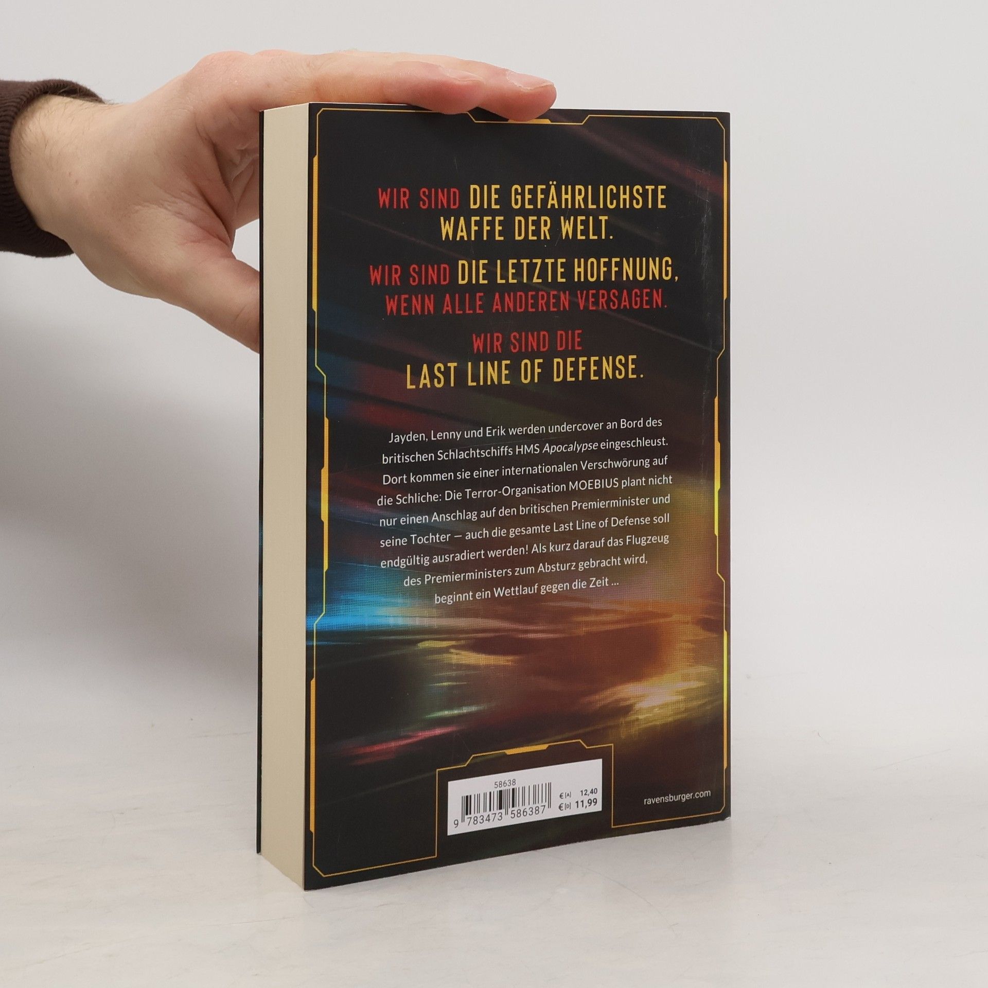 Wir sind die gefährlichste Waffe der Welt. Wir sind die letzte Hoffnung, wenn alle anderen versagen. Wir sind die Last Line of Defense. Jayden, Lenny und Erik werden undercover an Bord des britischen Schlachtschiffs HMS Apocalypse eingeschleust. Dort kommen sie einer internationalen Verschwörung auf die Schliche: Die Terror-Organisation MOEBIUS plant nicht nur einen Anschlag auf den britischen Premierminister und seine Tochter – auch die gesamte Last Line of Defense soll diesmal endgültig ausradiert werden! Als kurz darauf das Flugzeug des Premierministers zum Absturz gebracht wird, beginnt ein Wettlauf gegen die Zeit … Fortsetzung der rasanten Action-Thriller-Reihe von Bestseller-Autor Andreas Gruber Nur eine Handvoll Eingeweihter weiß über das geheime Ausbildungsprogramm Last Line of Defense Bescheid. Dort werden Jugendliche zu Geheimagenten ausgebildet – sie werden eingesetzt, wenn MI5, MI6 oder andere Spezialeinheiten nicht mehr weiterkommen. Die neusten Rekruten: Jayden D. Knoxville, Leonarda „Lenny“ Zarakis und Erik Tuomi. Sie sind Team Omega, das letzte und jüngste Team der Organisation – und landen früher als gedacht mitten in ihrem ersten Einsatz! Erlebe alle Missionen der "Last Line of Defense"! Band 1: Der Angriff Band 2: Die Bedrohung Band 3: Der Crash