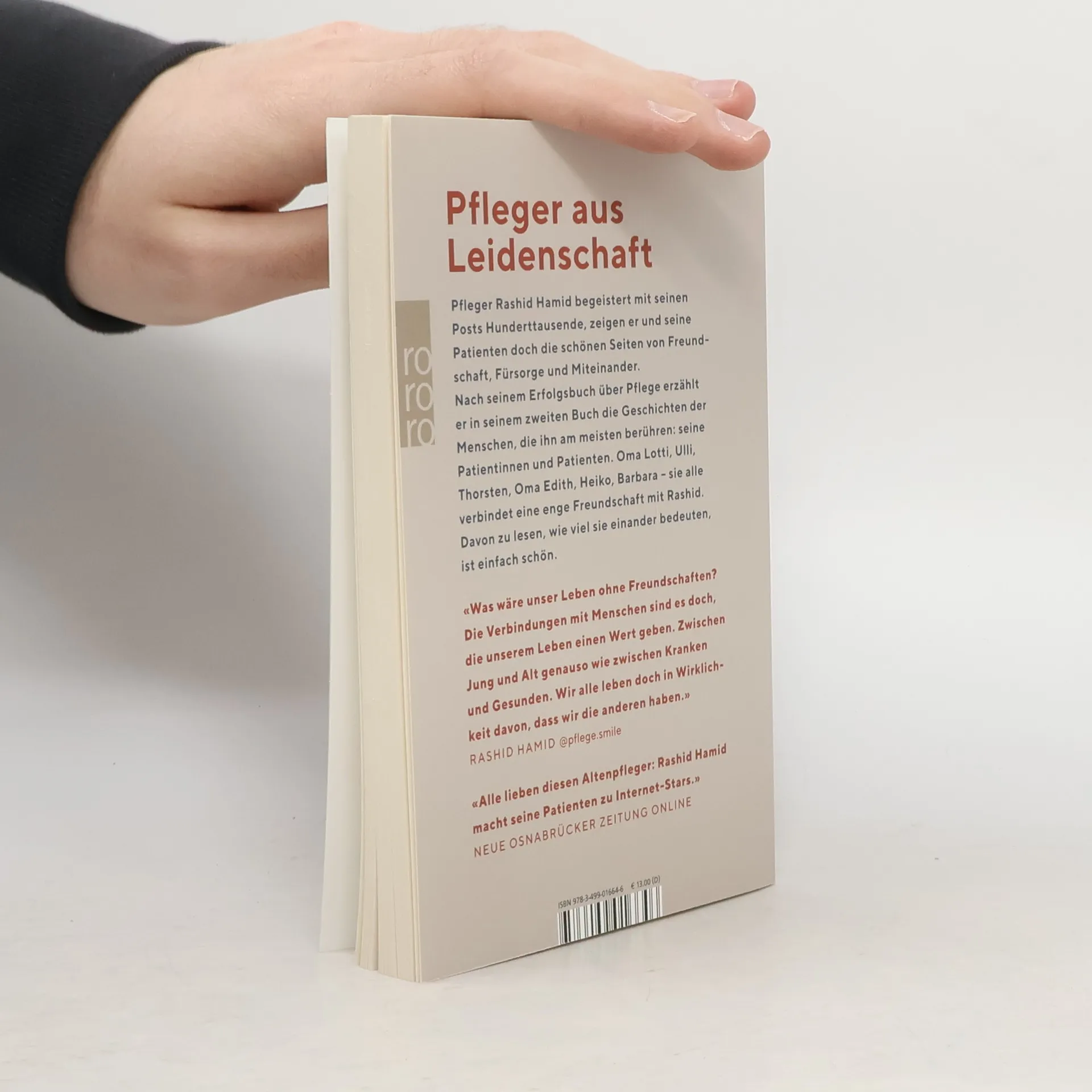 Der wohl beliebteste Pfleger Deutschlands Rashid Hamid hat mit seinem ersten Buch «Ein Herz und eine Pflege» zahlreiche Menschen begeistert – und gezeigt, was seinen Alltag als Pfleger zu etwas ganz Besonderem macht. In seinem zweiten Buch erzählt der sympathische Hamburger die Geschichten der Menschen, vor denen er am meisten Respekt hat: seinen Patientinnen und Patienten. Oma Lotti, Heiko, Thorsten, Barbara, Uli, Oma Edith – sie alle sind ihm wichtig, und ihre Geschichten verdienen es, erzählt zu werden. Aus Sicht Rashids, der sicher ist: Freundschaft kennt kein Alter. Ein Buch, das die positiven Seiten des Lebens feiert und zeigt, wie zwischenmenschliche Werte wie Freundschaft und Vertrauen Alter und Krankheit besiegen – und eine Community begeistern können, die ihren Helden viel zurückgibt. @pflege.smile