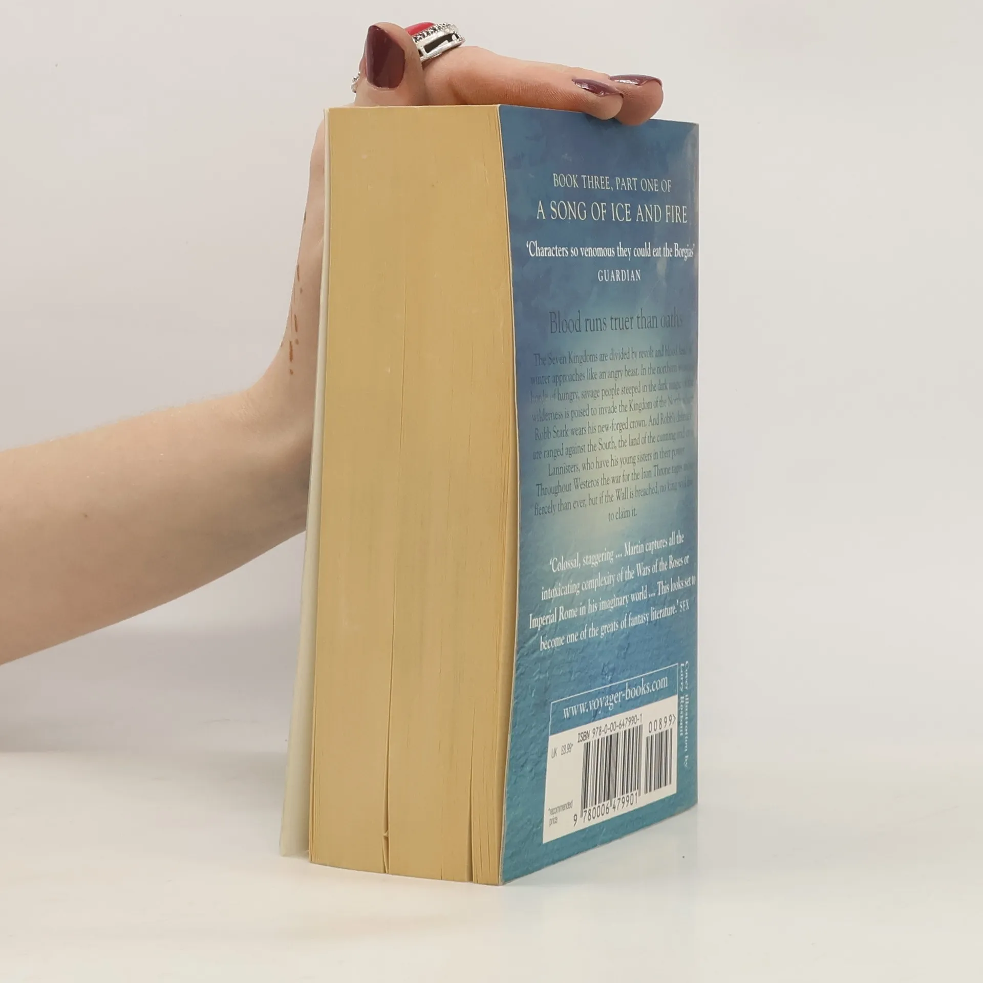 The Seven Kingdoms are engulfed in turmoil as three contenders vie for the throne. Robb Stark defends his kingdom against the Greyjoys, while Winterfell lies in ruins. Jon Snow faces an escalating threat beyond the Wall, and Daenerys Stormborn, with her dragons, continues to gain strength. This third volume in the series showcases a rich tapestry of magic, mystery, intrigue, romance, and adventure, solidifying its status as a modern fantasy masterpiece. Amidst the chaos, one contender is dead, another is in disfavor, yet the wars rage on with shifting alliances. Joffrey Lannister sits uneasily on the Iron Throne, while his rival, Lord Stannis, suffers defeat at the hands of a jealous sorceress. Young Robb Stark rules the North from Riverrun, plotting against the Lannisters, who hold his sister hostage in King's Landing. Meanwhile, Daenerys, the exiled queen, traverses a blood-soaked continent with her three remaining dragons. As forces clash for a decisive battle, an army of wildlings emerges, led by a horde of mythical Others—supernatural beings whose animated corpses pose an unstoppable threat. With the fate of the realm at stake, the Seven Kingdoms are on the brink of a cataclysmic storm of swords.