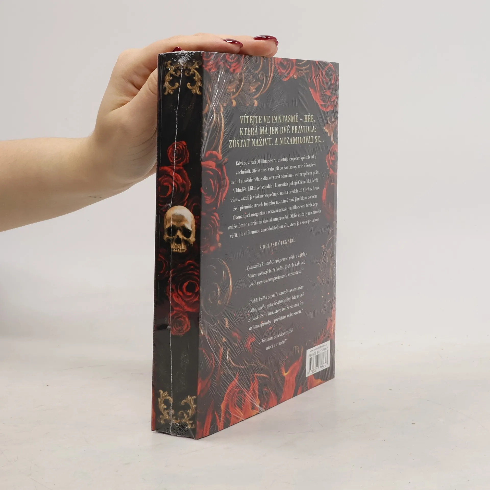 Když Ofélii a Genevieve náhle zemře matka, nemají ani čas truchlit. Ofélie totiž zdědila nejen mocnou nekromantskou magii, ale také obrovský dluh na jejich domě. Situace se však brzy ještě zhorší, protože Genevieve se rozhodne úvěr splatit tím, že vstoupí do Fantasmy – soutěže, kterou většina soutěžících nepřežije, ale vítězi se splní jedno přání. Aby mohla Ofélie sestru zachránit, musí se hry sama zúčastnit. Fantasma je však prokletým sídlem plným klikatých chodeb a honosných pokojů, v nichž číhají svůdní démoni a hříšná pokušení. Ofélie musí překonat celých devět úrovní zkoušek, aby zvítězila…, pokud ji tedy dřív nepřemůže vlastní strach. Když jí arogantní neznámý muž nabídne, že by ji mohl ochránit a vést, Ofélie ví, že by mu neměla věřit. Blackwell totiž možná nevypadá nebezpečně, ale zdání může klamat. Jenže v sázce je život její sestry, a tak si nemůže dovolit ho odmítnout. Důležité je, aby ignorovala neodolatelnou temnou přitažlivost, která je k sobě neustále táhne. Ztráta vlastního srdce je totiž ve Fantasmě nebezpečnější než prohra. Limitovaná edice populární knihy Fantasma. Jako první kniha v České republice vychází s exkluzivní 3D ořízkou, a to v nákladu pouhých 300 kusů.
