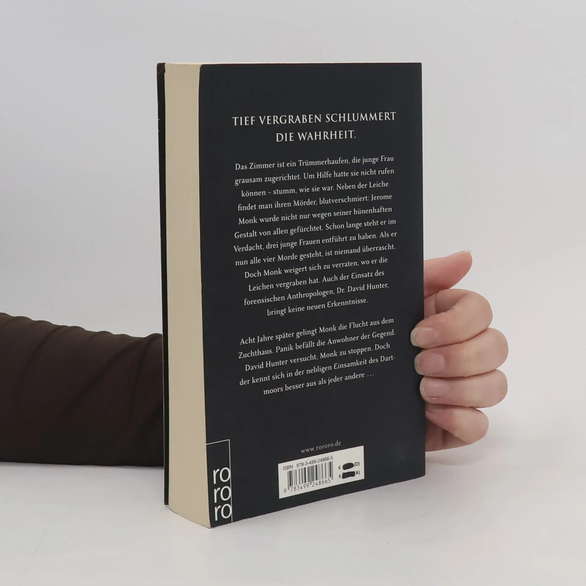 Tief vergraben schlummert die Wahrheit. Das Zimmer ist ein Trümmerhaufen, die junge Frau grausam zugerichtet. Neben der Leiche findet man den Mörder, blutverschmiert: Schon lange steht Jerome Monk im Verdacht, drei junge Frauen getötet zu haben. Als er nun alle vier Morde gesteht, ist niemand überrascht. Doch Monk weigert sich zu verraten, wo er die Leichen vergraben hat. Auch der Einsatz des forensischen Anthropologen, Dr. David Hunter, bringt keine neuen Erkenntnisse. Acht Jahre später gelingt Monk die Flucht aus dem Zuchthaus. Panik befällt die Anwohner der Gegend. David Hunter versucht, Monk zu stoppen. Doch der kennt sich in der nebligen Einsamkeit des Dartmoor besser aus als jeder andere ...