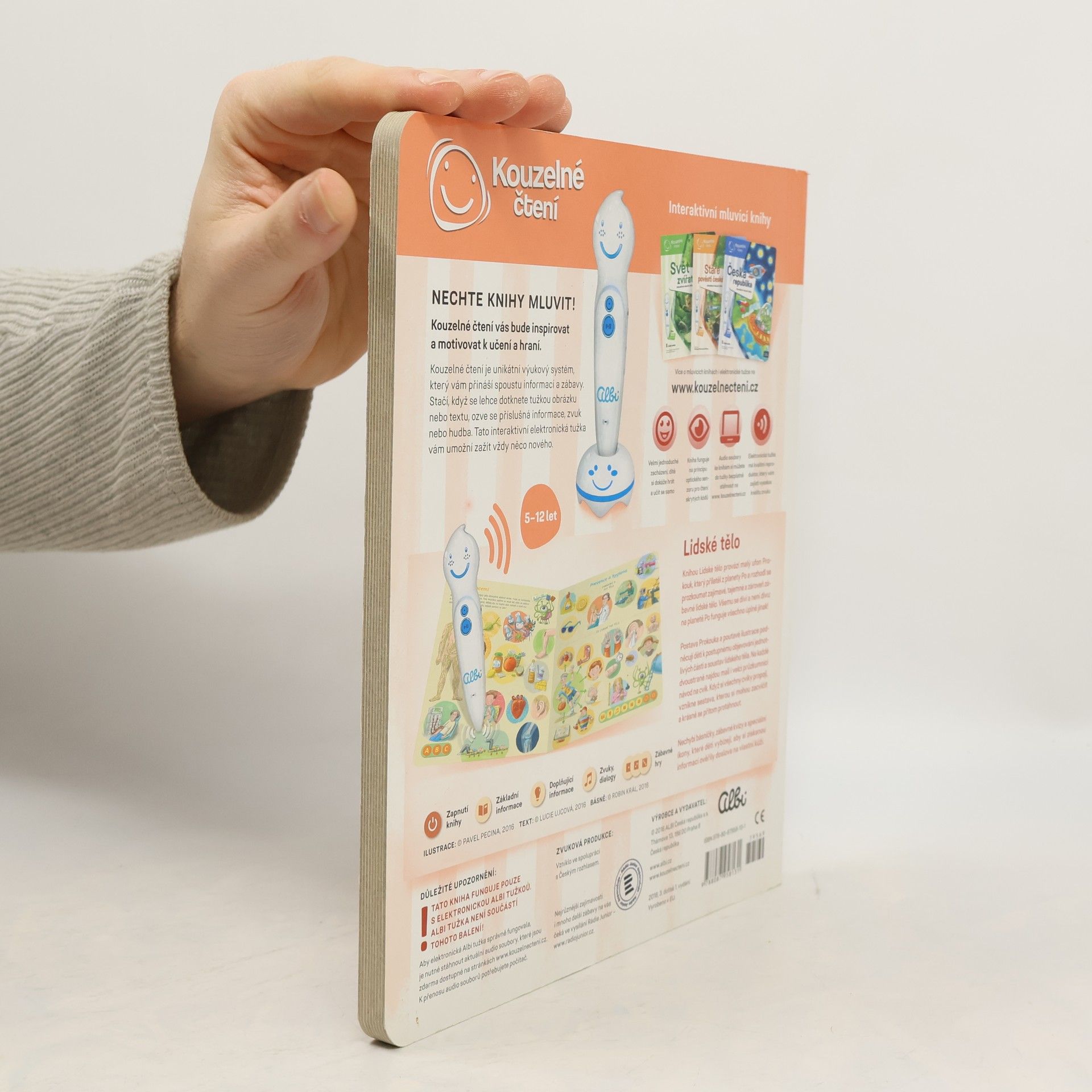 Interaktivní mluvící kniha z edice Kouzelné čtení, se kterou se děti již od 3 let dozvědí spoustu zajímavých a užitečných informací o našem těle. Knihou Lidské tělo provází malý ufon Prokouk, který přiletěl z planety Po, aby prozkoumal taje lidského těla. Všemu se diví a není divu: na planetě Po funguje všechno úplně jinak! Postava Prokouka a poutavé ilustrace podněcují děti k postupnému objevování jednotlivých částí a soustav lidského těla. Kniha je členěna do 8 kapitol a témata jsou např. Kosti a svaly, Mozek a nervy, Rozmnožování, Trávicí soustava, Srdce a plíce atd. Na každé dvoustraně najdou malí i velcí průzkumníci návod na cvik. Když si všechny cviky propojí, vznikne sestava, kterou si mohou zacvičit a krásně se přitom protáhnout. V knize Lidské tělo najdete také básničky, zábavné kvízy a speciální ikony, které děti vybízí, aby si získanou informaci zkusili doslava na vlastní kůži. Kniha obsahuje téměř 2000 zvuků a textů. Knihu ilustroval Pavel Pecina, básničky napsal Robin Král, texty Lucie Ujcová. Vzniklo ve spolupráci s Českým rozhlasem, knihu namluvili Tereza Bebarová a Jaroslav Plesl.