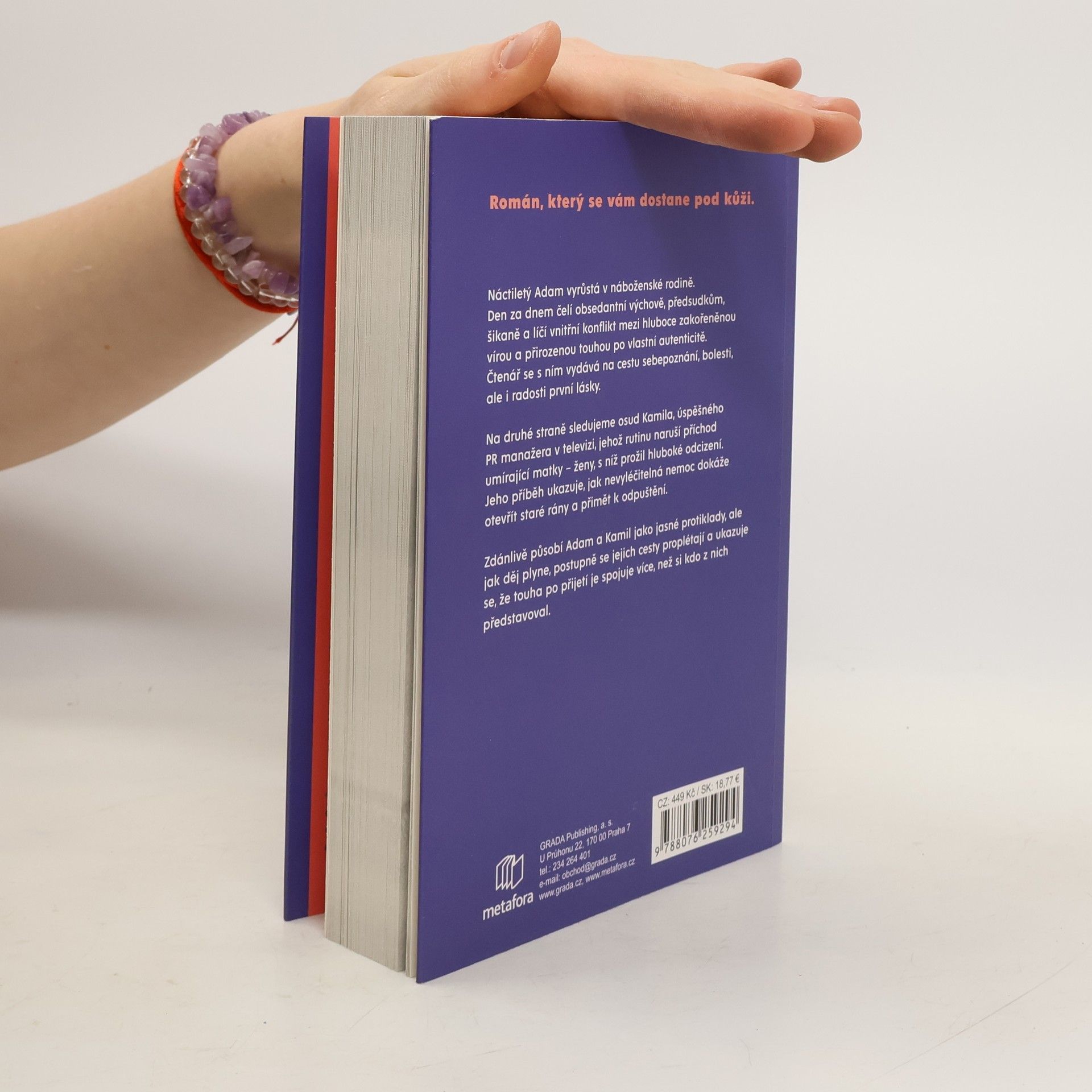Náctiletý Adam vyrůstá v náboženské rodině. Den za dnem čelí obsedantní výchově, předsudkům, šikaně a líčí vnitřní konflikt mezi hluboce zakořeněnou vírou a přirozenou touhou po vlastní autenticitě. Čtenář se s ním vydává na cestu sebepoznání, bolesti, ale i radosti první lásky. Na druhé straně sledujeme osud Kamila, úspěšného PR manažera v televizi, jehož rutinu naruší příchod umírající matky – ženy, s níž prožil hluboké odcizení. Jeho příběh ukazuje, jak nevyléčitelná nemoc dokáže otevřít staré rány a přimět k odpuštění. Zdánlivě působí Adam a Kamil jako jasné protiklady, ale jak děj plyne, postupně se jejich cesty proplétají a ukazuje se, že touha po přijetí je spojuje více, než si kdo z nich představoval.