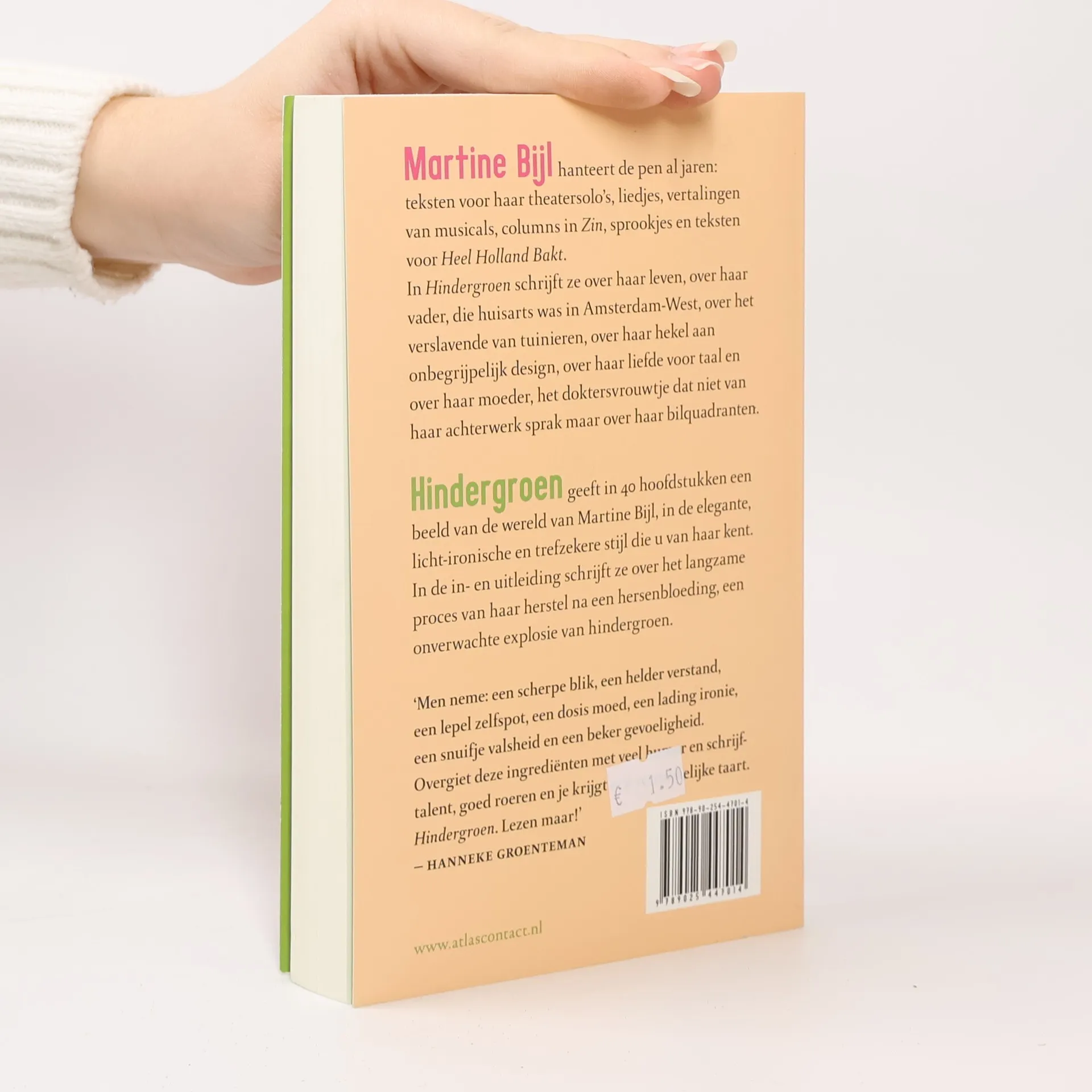 Martine Bijl hanteert de pen al jaren: teksten voor haar theatersolo's, liedjes, vertalingen van musicals, columns in Zin, sprookjes en teksten voor Heel Holland Bakt. In Hindergroen schrijft ze over haar leven, over haar vader, die huisarts was in Amsterdam-West, over het verslavende van tuinieren, over haar hekel aan onbegrijpelijk design, over haar liefde voor taal en over haar moeder, het doktersvrouwtje dat niet van haar achterwerk sprak maar over haar bilquadranten. Hindergroen geeft in 40 hoofdstukken een beeld van de wereld van Martine Bijl, in de elegante, licht-ironische en trefzekere stijl die u van haar kent. In de in- en uitleiding schrijft ze over het langzame proces van haar herstel na een hersenbloeding, een onverwachte explosie van hindergroen.