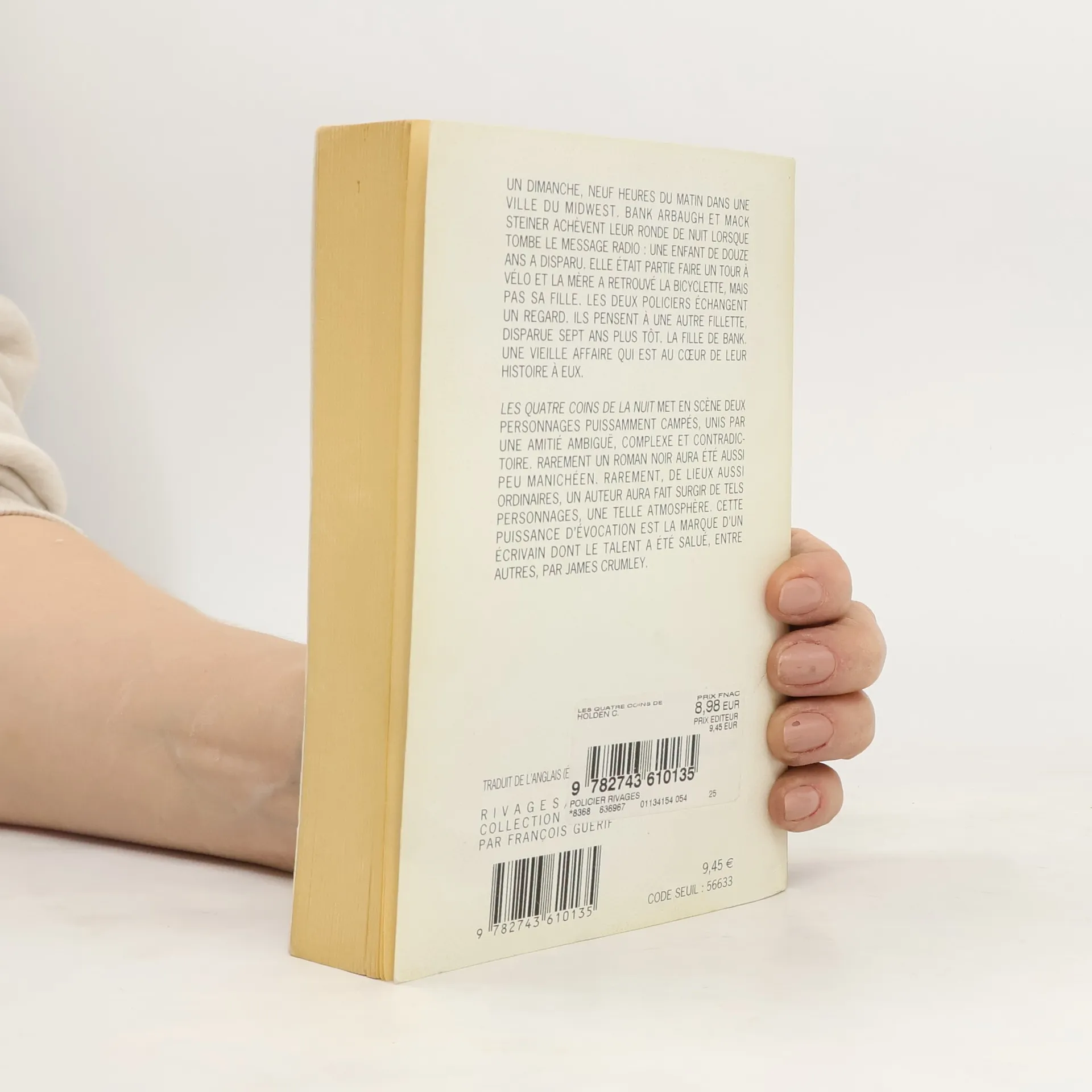 Un dimanche, neuf heures du matin dans une ville du Midwest. Bank Arbaugh et Mack Steiner achèvent leur ronde de nuit lorsque tombe le message radio : une enfant de douze ans a disparu. Elle était partie faire un tour à vélo et la mère a retrouvé la bicyclette, mais pas sa fille. Les deux policiers échangent un regard. Ils pensent à une autre fillette, disparue sept ans plus tôt. La fille de Bank. Une vieille affaire qui est au cœur de leur histoire à eux. Les quatre coins de la nuit met en scène deux personnages puissamment campés, unis par une amitié ambiguë, complexe et contradictoire. Rarement un roman noir aura été aussi peu manichéen. Rarement, de lieux aussi ordinaires, un auteur aura fait surgir de tels personnages, une telle atmosphère. Cette puissance d'évocation est la marque d'un écrivain dont le talent a été salué, entre autres, par James Crumley.