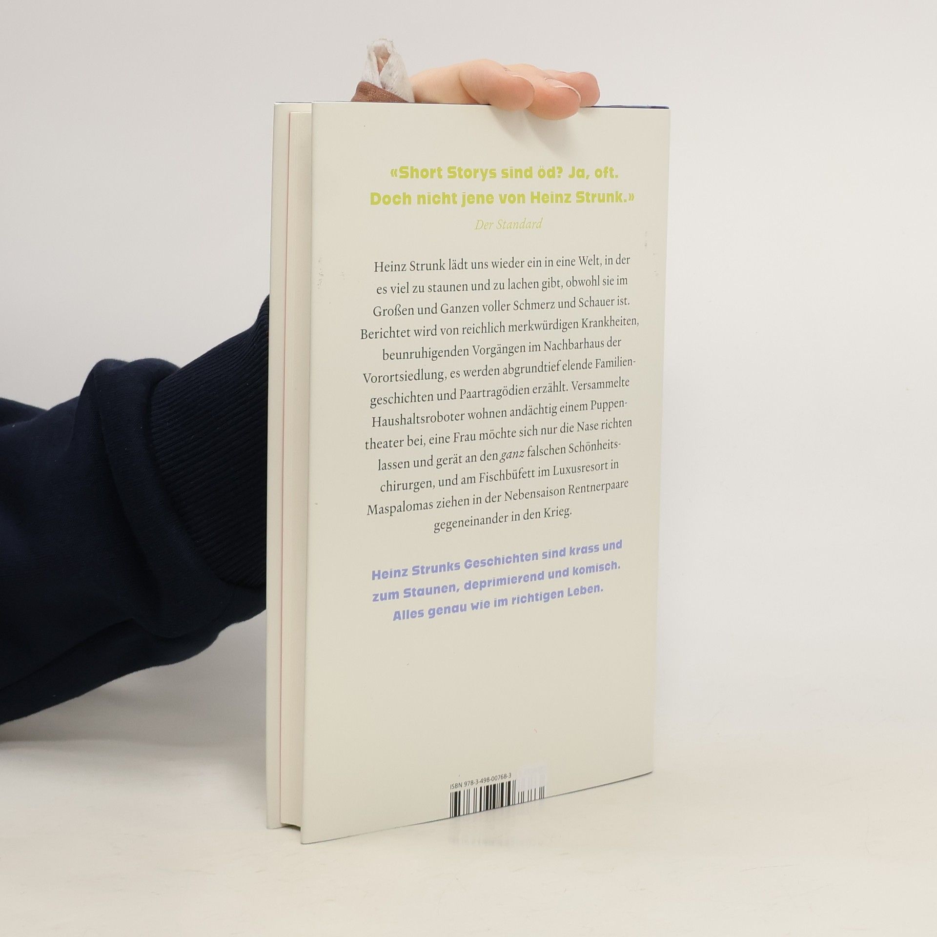 «Short Storys sind öd? Ja, oft. Doch nicht jene von Heinz Strunk.» Der StandardHeinz Strunk lädt uns wieder ein in eine Welt, in der es viel zu staunen und zu lachen gibt, obwohl sie im Großen und Ganzen voller Schmerz und Schauer ist. Berichtet wird von ganz schön merkwürdigen Krankheiten, beunruhigenden Vorgängen im Nachbarhaus der Vorortsiedlung, es werden abgrundtief elende Familiengeschichten und Paartragödien erzählt. Versammelte Haushaltsroboter wohnen andächtig einem Puppentheater bei, eine Frau möchte sich nur die Nase richten lassen und gerät an den ganz falschen Schönheitschirurgen, und am Fischbuffet im Luxusresort in Maspalomas ziehen in der Nebensaison Rentnerpaare gegeneinander in den Krieg.Die Welt von Heinz Strunk wirkt düster und fremd, obwohl oder weil sie mit jeder Faser mit unserer eigenen Realität verbunden ist.