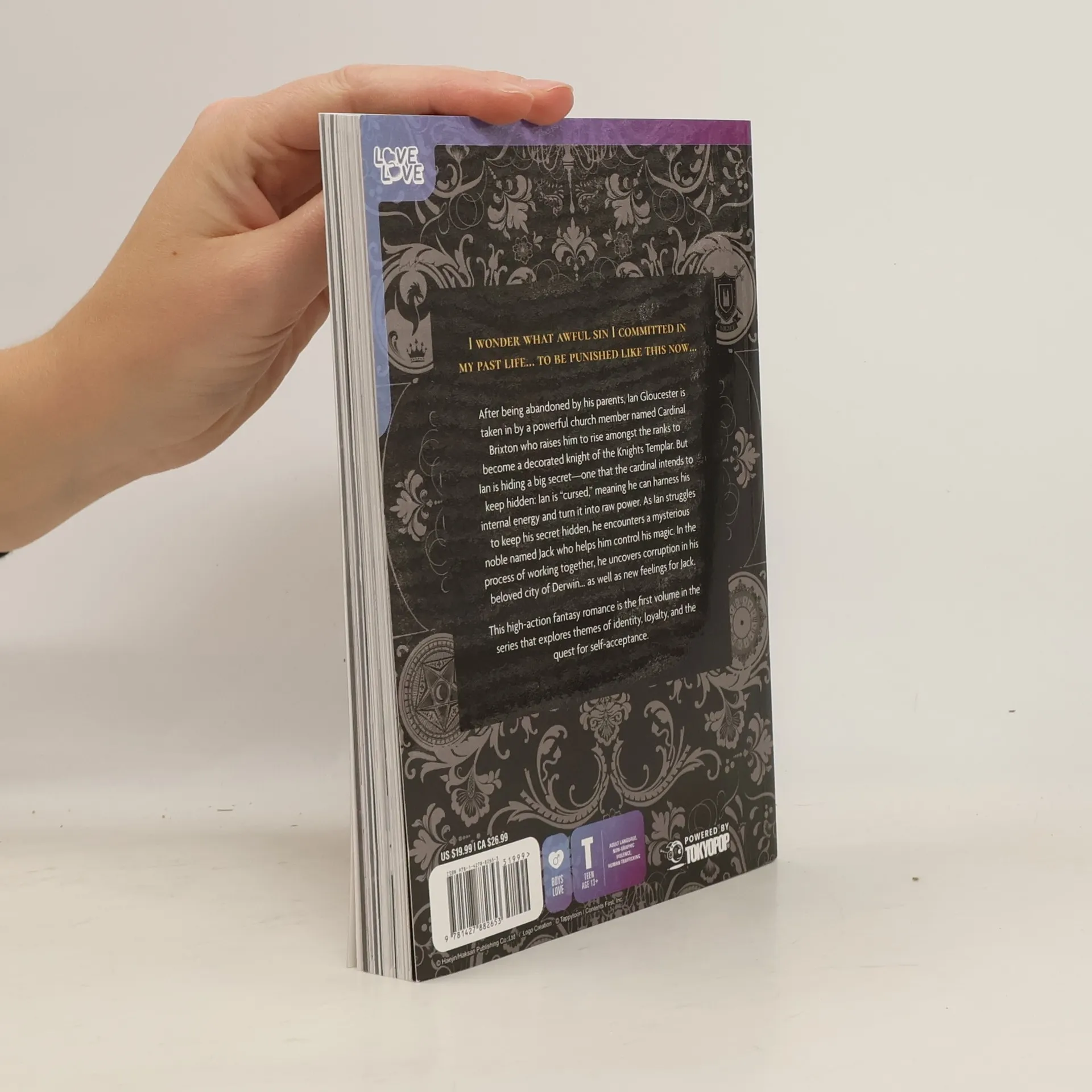 A sweeping fantasy full of magic, political intrigue, and spicy romance. The first volume of the popular webtoon for fans of epic fantasy, spicy romances, and of the author's previous webtoon "The Sweetest Man" "I wonder what awful sin I committed in my past life... to be punished like this now..." After being abandoned by his parents, Ian Gloucester is taken in by a powerful church member named Cardinal Brixton who raises him to rise amongst the ranks to become a decorated knight of the Knights Templar. But Ian is hiding a big secret--one that the cardinal intends to keep hidden: Ian is "cursed," meaning he can harness his internal energy and turn it into raw power. As Ian struggles to keep his secret hidden, he encounters a mysterious noble named Jack who helps him control his magic. In the process of working together, he uncovers corruption in his beloved city of Derwin... as well as new feelings for Jack. This high-action fantasy romance is the first volume in the series that explores themes of identity, loyalty, and the quest for self-acceptance.