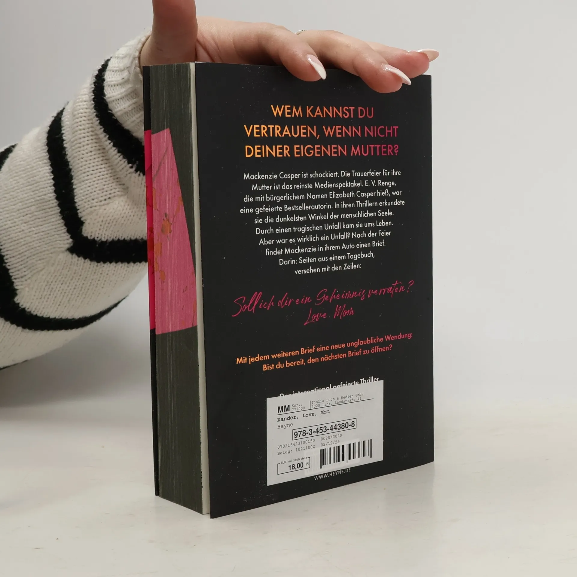 Wem kannst du vertrauen, wenn nicht deiner eigenen Mutter? Mit Farbschnitt in limitierter Erstauflage – Lieferung je nach Verfügbarkeit Studentin Mackenzie Casper hat stets im Schatten ihrer berühmten Mutter Elizabeth gelebt, einer der bekanntesten Thriller-Autorinnen der Welt. Doch jetzt ist Elizabeth tot. Mackenzie ist nicht die Einzige die Zweifel daran hat, dass es ein tragischer Unfall war. Auf der Trauerfeier erhält sie einen mysteriösen Brief mit Seiten aus dem Tagebuch ihrer Mutter. Weitere Briefe folgen. Hatte ihre Mom Geheimnisse, die sie das Leben kosteten? Um das herauszufinden, muss Mackenzie selbst Nachforschungen anstellen. Dabei darf sie niemandem trauen. Vor allem nicht ihrer Familie.