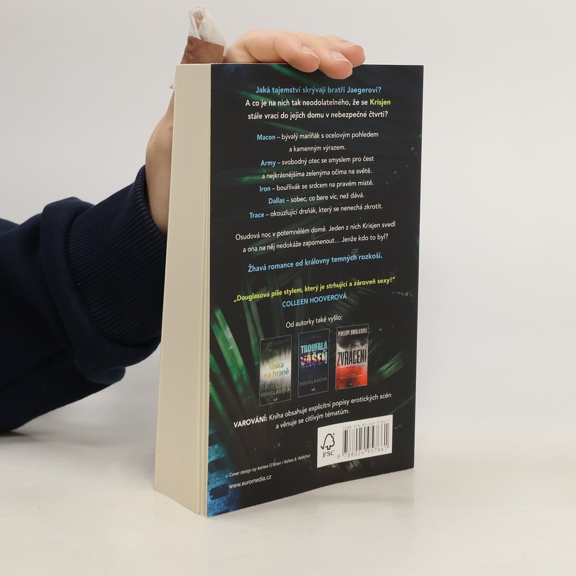 Krisjen žije v bohaté čtvrti, ale rozvod rodičů a péče o mladší sourozence ji momentálně tak vyčerpávají, že se raději chodí odreagovat na nebezpečnou druhou stranu městečka. Tam bydlí bratři Jaegerovi. Nejstarší Macon, bývalý mariňák, který se snad nikdy neusmívá. Army, singl táta s nejkrásnějšíma zelenýma očima na světě. Iron, fajn kluk s prudkou povahou, která ho brzy dostane do vězení. Dallas, sobec, který umí jen brát, a co zbyde, jednoduše odhodí. A Trace, s nímž se Krisjen tak trochu zaplete. Jenže když ji jedné noci v potemnělém domě někdo vezme do náruče, něco jí říká, že to není Trace.