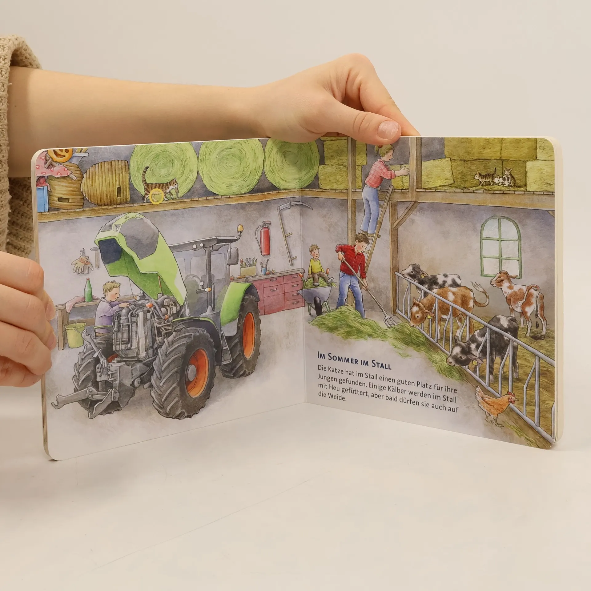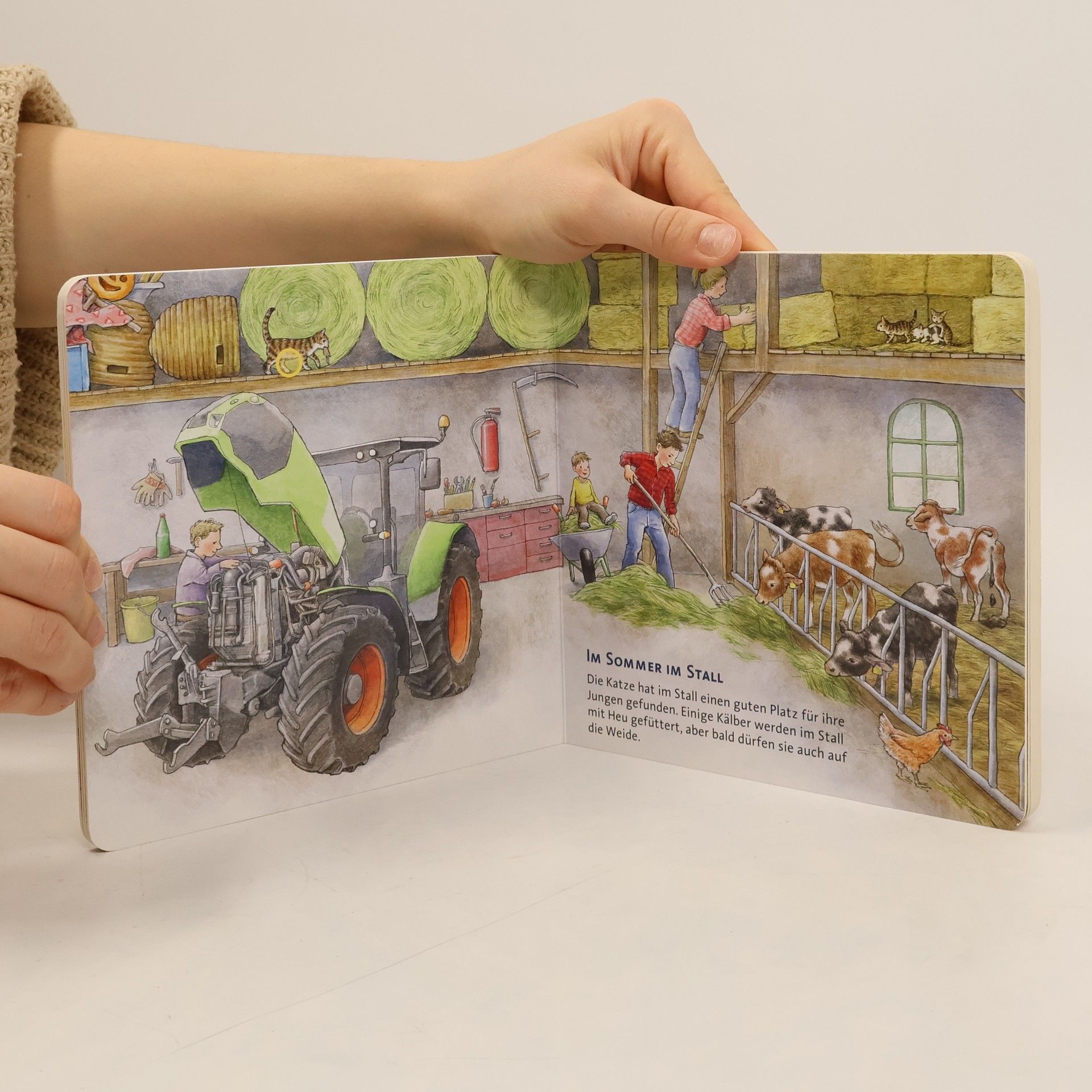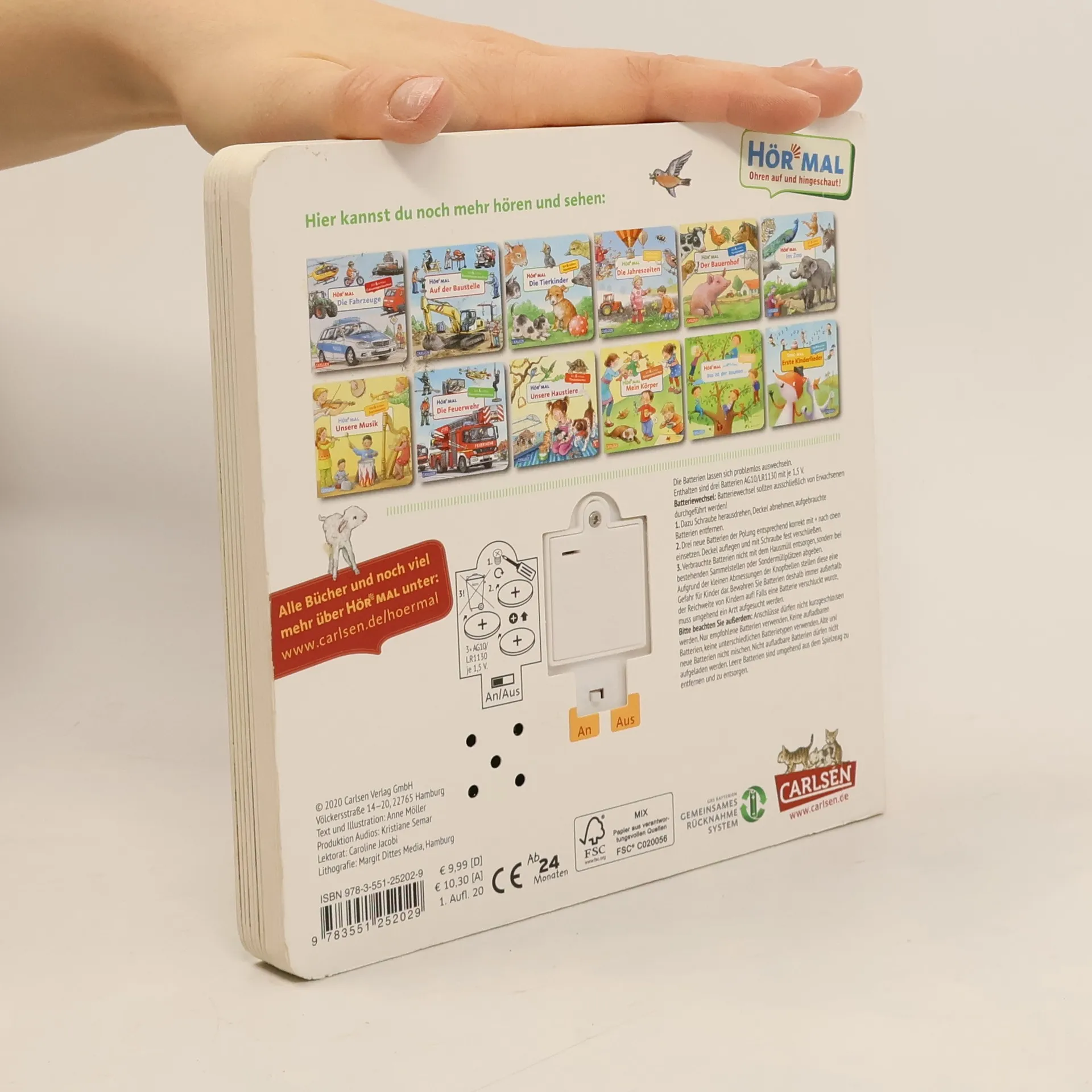 Auf dem Bauernhof ist das ganze Jahr etwas zu tun: Im Frühling wird mit dem Traktor das Feld bestellt. Mit dem riesigen Mähdrescher wird im Sommer die Ernte eingeholt. Im Herbst werden die Kartoffeln und Äpfel geerntet und die Tiere wollen rund ums Jahr versorgt werden. Jede Jahreszeit bringt ihre eigenen Aufgaben und ihren eigenen Klang. Das erwartet euch in jedem Hör-mal-Soundbuch: 6 leicht auslösbare Sounds mit einer Gesamtspielzeit von bis zu 100 Sekunden Aktivierung und Deaktivierung der Geräusche durch Druck auf die farbig markierten Punkte auf jeder Doppelseite Einfaches Auswechseln der Batterien, wenn die Sounds nicht mehr die volle Spielzeit haben oder sich nur noch schwer auslösen lassen. Problemlose Bedienung ab 2 Jahren Bei jüngeren Kindern sollten die Eltern die Soundbuttons drücken, da die Feinmotorik und Kraft der kleinen Finger noch nicht ausreicht. Alle Titel der Reihe unterliegen strengen Sicherheitsanforderungen und Qualitätskontrollen. Jeder Soundknopf wird vor der Auslieferung auf seine Funktionsfähigkeit geprüft. Die Lautstärke der Sounds entspricht den Vorgaben der europäischen Spielzeugrichtlinie. Ausgeliefert werden die Bücher mit 3 handelsüblichen Knopfzell-Batterien LR 1130 mit je 1,5 V.
