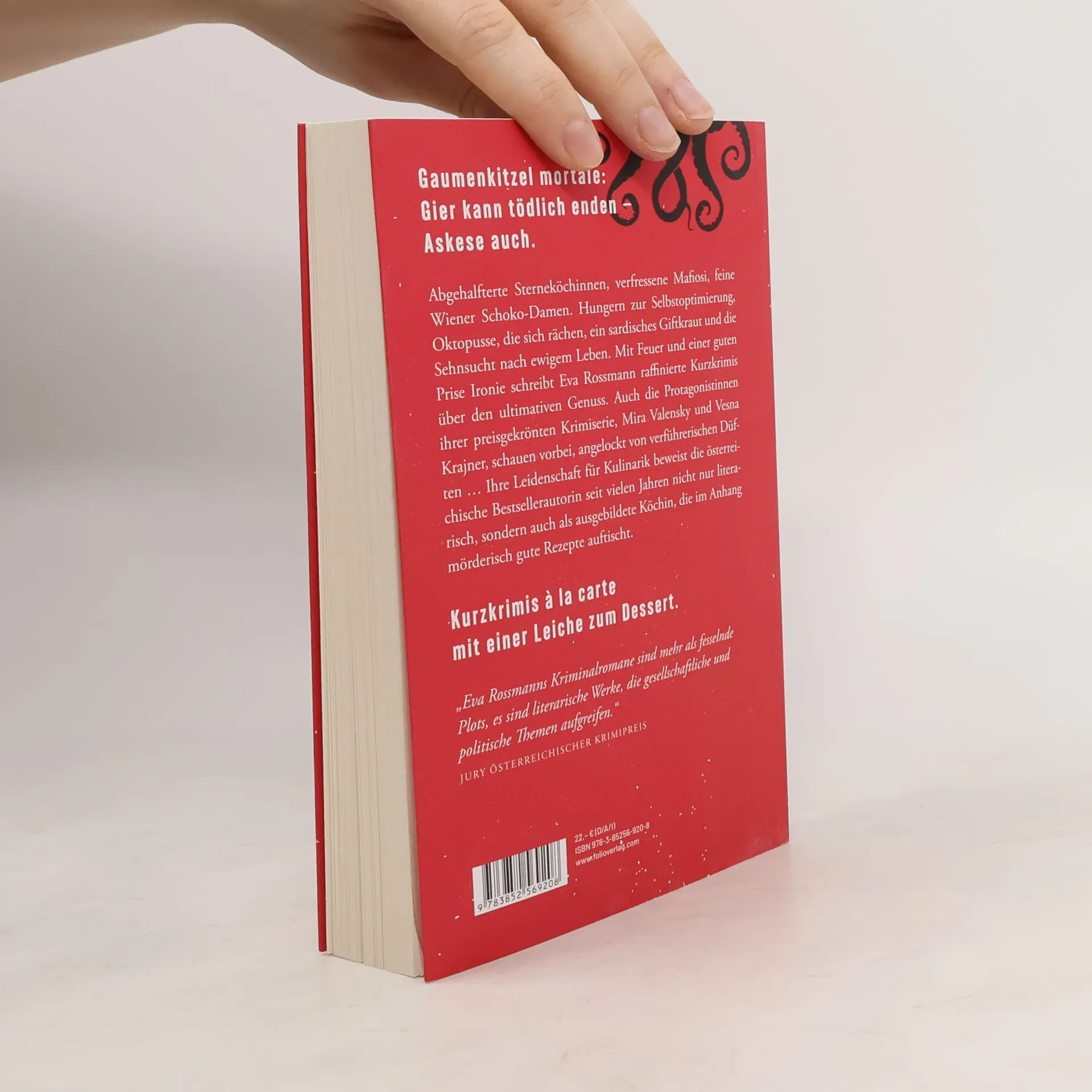 Gaumenkitzel mortale: Gut essen kann tödlich enden. Abgehalfterte Sterneköchinnen, verfressene Mafiosi feine Wiener Schoko‑Damen. Und Oktopusse, die sich rächen, oder Kräuter, die Leben verkürzen. Mit Feuer und einer guten Prise Ironie schreibt Eva Rossmann raffinierte Kurzkrimis über den ultimativen Genuss. Auch die Protagonistinnen ihrer preisgekrönten Krimiserie, Mira Valensky und Vesna Krajner, schauen vorbei, angelockt von verführerischen Düften … Ihre Leidenschaft für Kulinarik beweist die österreichische Bestsellerautorin seit vielen Jahren nicht nur literarisch, sondern auch als ausgebildete Köchin, die im Anhang mörderisch gute Rezepte auftischt. Kurzkrimis à la carte mit einer Leiche zum Dessert.