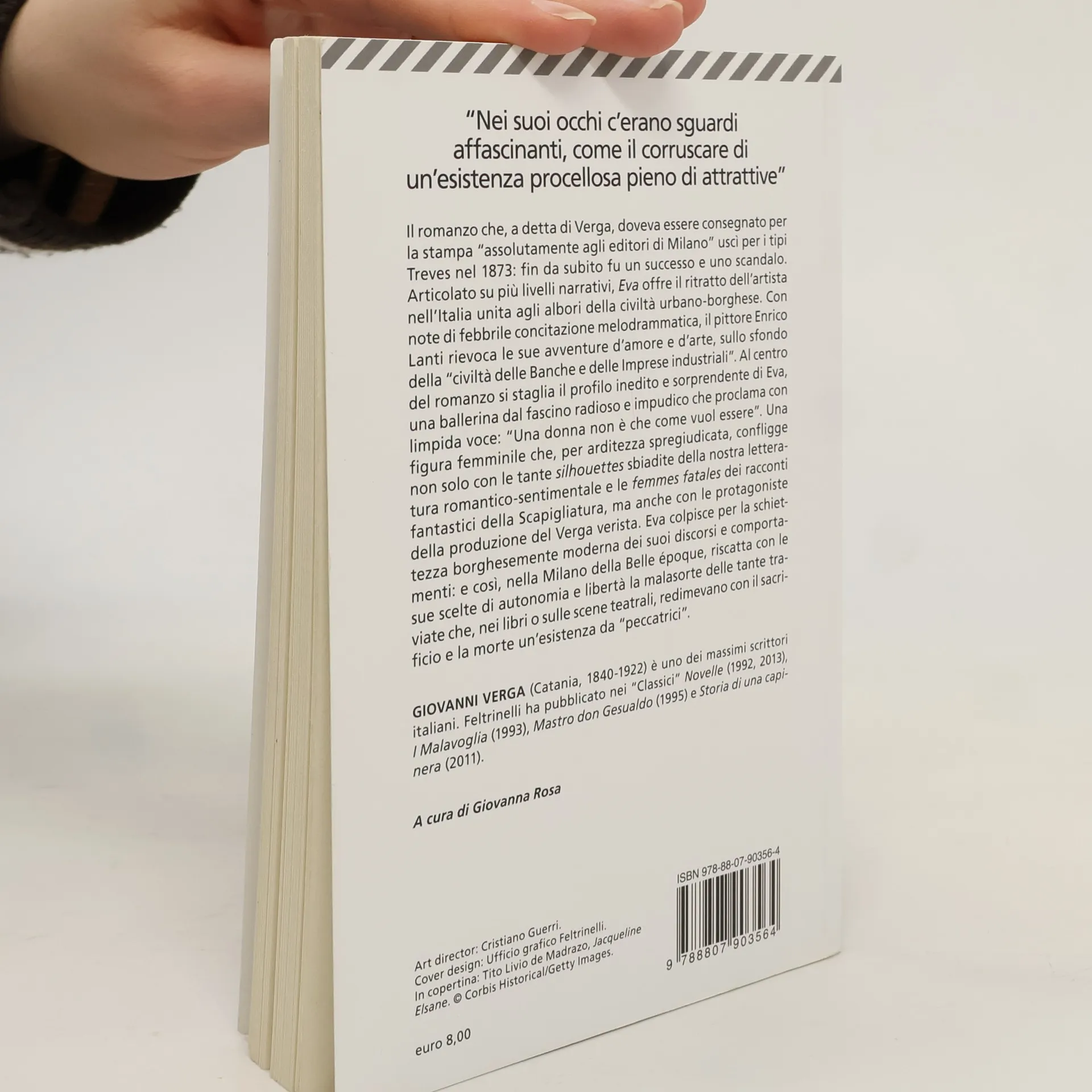 Il romanzo, che a detta di Verga, doveva essere consegnato per la stampa "assolutamente agli editori di Milano" esce per i tipi Treves nel 1873: fin da subito fu un successo e uno scandalo. Articolato su più livelli narrativi, Eva offre il ritratto dell'artista nell'Italia unita agli albori della civiltà urbano-borghese. Con note di febbrile concitazione melodrammatica, il pittore Enrico Lanti rievoca le sue avventure d'amore e d'arte, sullo sfondo della "civiltà delle Banche e delle Imprese industriali". Al centro del romanzo si staglia il profilo inedito e sorprendente di Eva, una ballerina dal fascino radioso e impudico che proclama con limpida voce: "Una donna non è che come vuol essere". Una figura femminile che, per arditezza spregiudicata, confligge non solo con le tante silhouette sbiadite della nostra letteratura romantico-sentimentale e le femmes fatales dei racconti fantastici della Scapigliatura, ma anche con le protagoniste della produzione del Verga verista. Eva colpisce per la schiettezza borghesemente moderna dei suoi discorsi e comportamenti: e così, nella Milano della Belle époque, riscatta con le sue scelte di autonomia e libertà la malasorte delle tante traviate che, nei libri o sulle scene teatrali, redimevano con il sacrificio e la morte un'esistenza da "peccatrici".