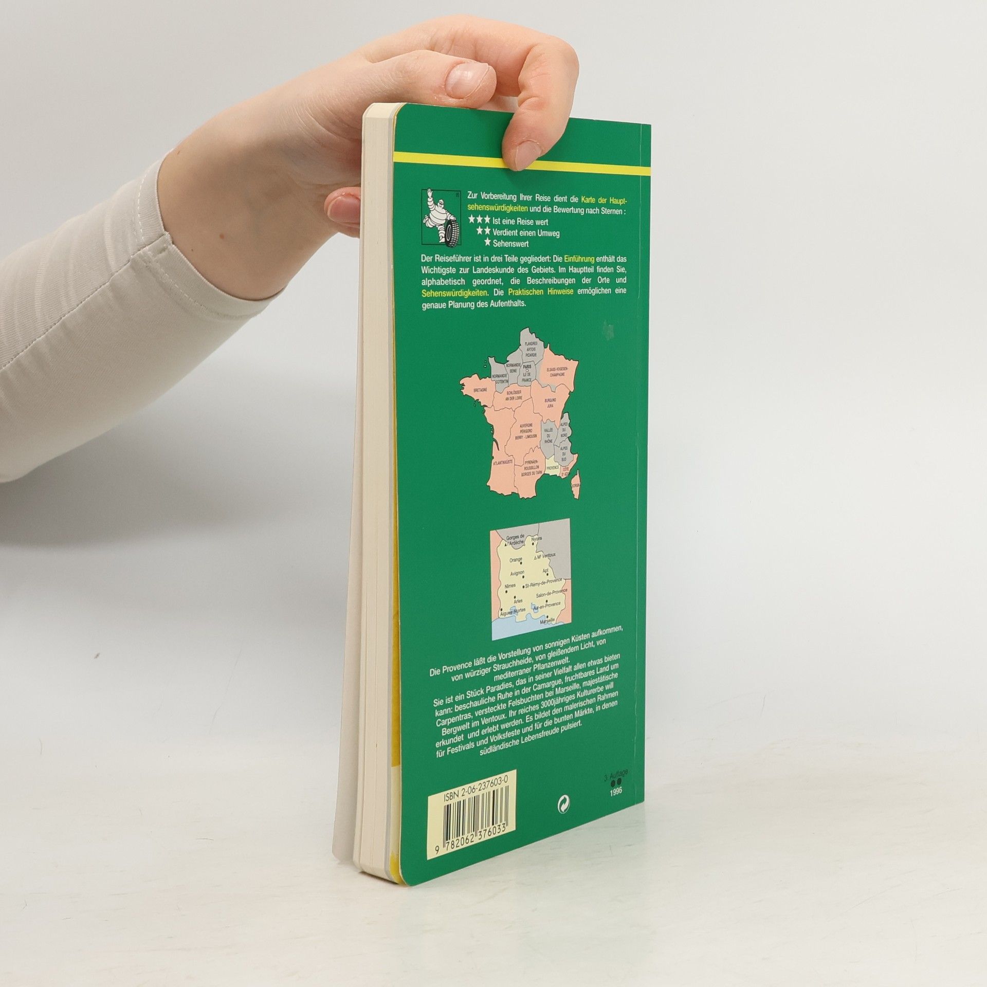 Dieser regelmässig aktualisierte Reiseführer erschliesst die zahireichen Kultur- und Naturdenkmäler der Provence. Die Bewertung der Sehenswürdigkeiten nach dem bewährten Michelin-Sterne-System erleichtert die Reiseplanung : ist eine Reise wert, verdient einen Umweg, sehenswert. Drei detaillierte Karten : Hauptsehenswürdigkeiten, Streckenvorschläge, Ferienorte. Umfassende Einführung mit interessanten Informationen über Land und Leute, Geschichte, Kunst und Architektur, Brauchtum und regionale Spezialitäten. Mehr als 70 Stadt- und Ubersichtspläne sowie Gebietskarten. Uber 130 Farbfotos und sonstige Illustrationen. 21 Seiten praktische Hinweise mit nützlichen Adressen, Tips zur Vorbereitung der Reise, Freizeitgestaltung, Veranstaltungskalender. Offnungszeiten und Eintrittspreise der Hauptsehenswürdigkeiten. Alphabetisches Orts- und Namensregister.