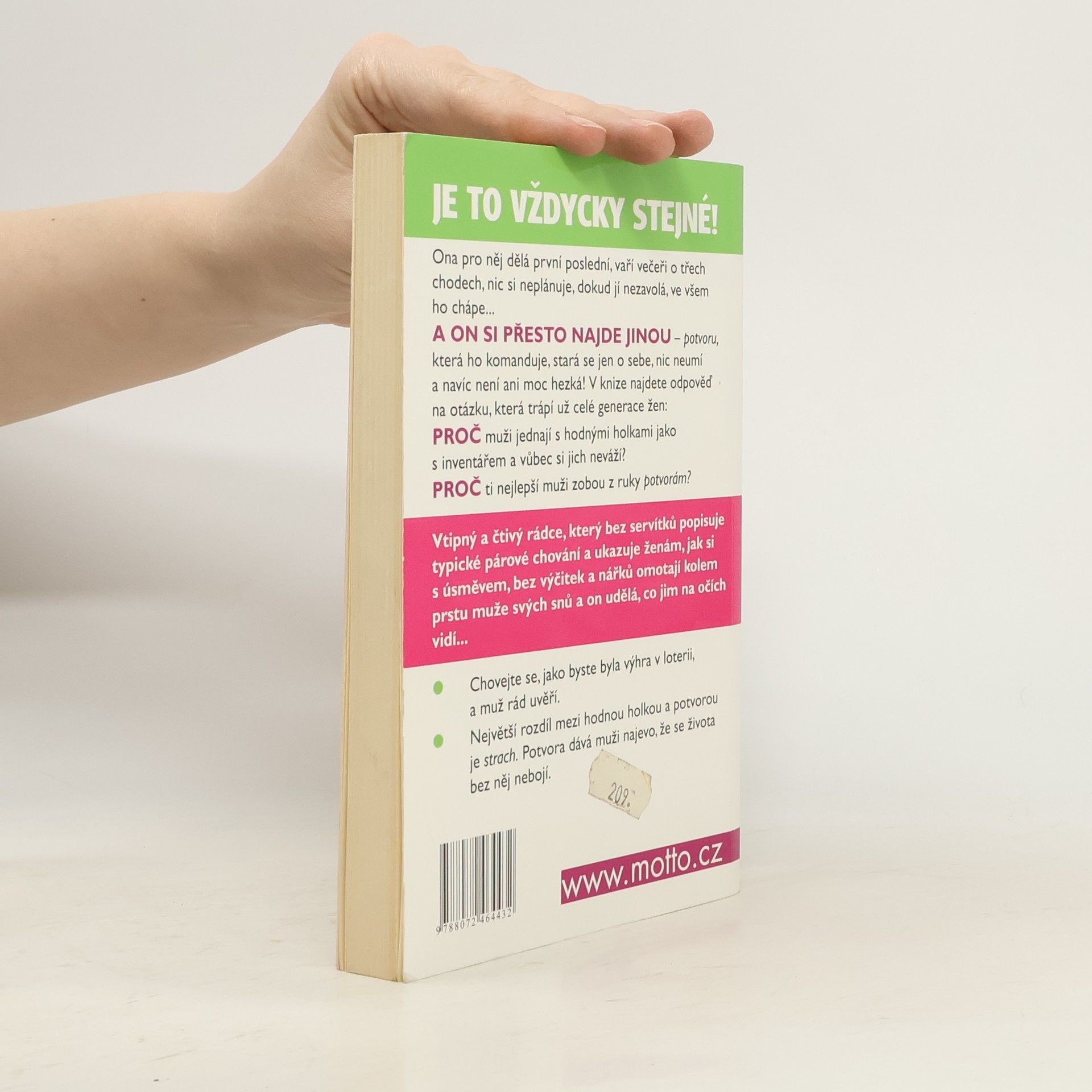 Vtipný a čtivý rádce, který bez servítku popisuje typické párové chování a ukazuje ženám, jak si s úsměvem, bez výčitek a nářku omotají kolem prstu muže svých snu a on udělá, co jim na očích vidí... Proč muži jednají s hodnými holkami jak s inventářem, ale zobou z ruky potvorám? Vtipná kniha, která otevřeně a bez zastírání popisuje typické párové chování. Poradí vám, jak si s úsměvem, bez výčitek a nářků, omotáte kolem prstu muže svých snů.