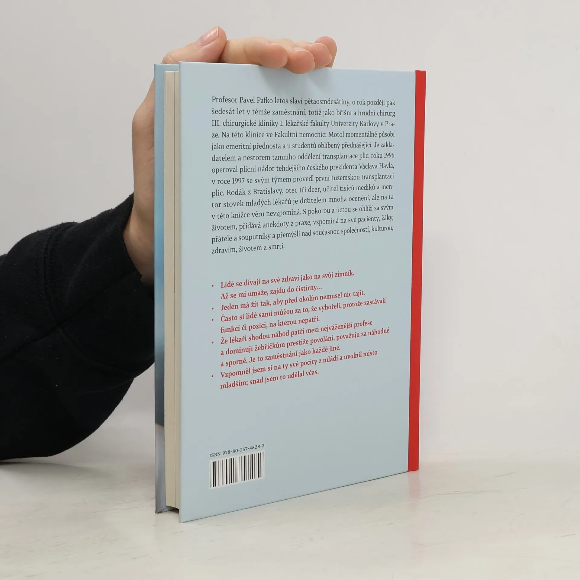Profesor Pavel Pafko letos v červenci slaví pětaosmdesátiny, o rok později pak šedesát let v témže zaměstnání, totiž jako břišní a hrudní chirurg III. chirurgické kliniky 1. lékařské fakulty Univerzity Karlovy v Praze. Rodák z Bratislavy, otec tří dcer, učitel tisíců mediků a mentor stovek mladých lékařů je držitelem mnoha ocenění, ale na ta v této knížce věru nevzpomíná – ani na pocty, ani na zásluhy. „Vždycky jsem to bral tak, že věci plynuly a já si jen tak plul. Nikdy jsem neuvažoval o tom, zda jsem na vrcholu nebo jak se na něj vyškrábat,“ říká Pavel Pafko, který se touto publikací s pokorou a úctou ohlíží za svým životem, přidává anekdoty z praxe, vzpomíná na své pacienty, žáky, přátele a souputníky a přemýšlí nad současnou společností, veřejnou sférou, kulturou, zdravím, životem a smrtí.