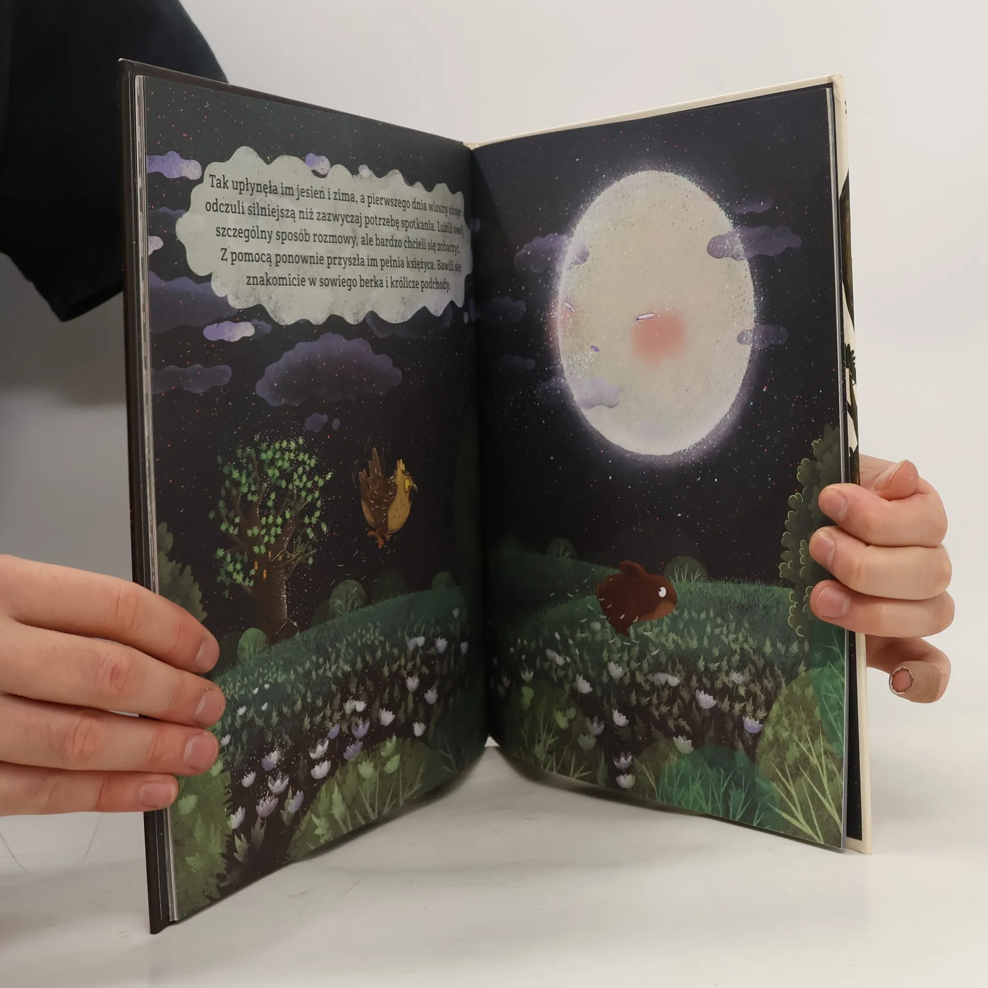 U podnóża starego dębu mieszka rodzina królików, a wysoko w koronie swoją dziuplę mają sowy. Choć żyją blisko siebie, jest im trudno się spotkać. Kiedy w słoneczny dzień Króliczek biega po łące, Sówka śpi w najlepsze, a kiedy ona rozprostowuje skrzydła do lotu w blasku księżyca, on właśnie smacznie zasypia. I tak mijają im dni i noce, a oni nic o sobie nie wiedzą. Aż do chwili, gdy oboje zapragną się poznać…