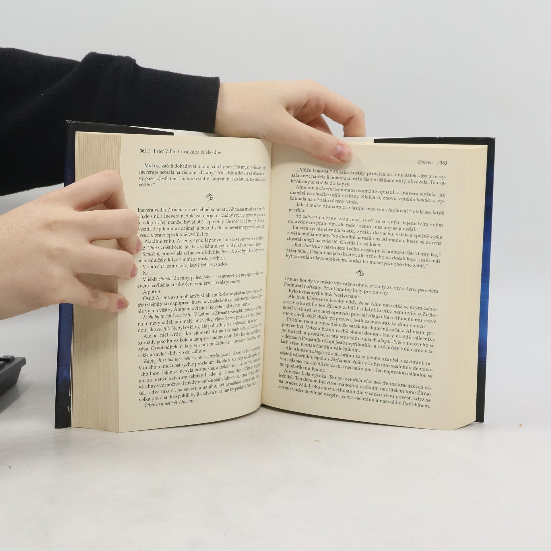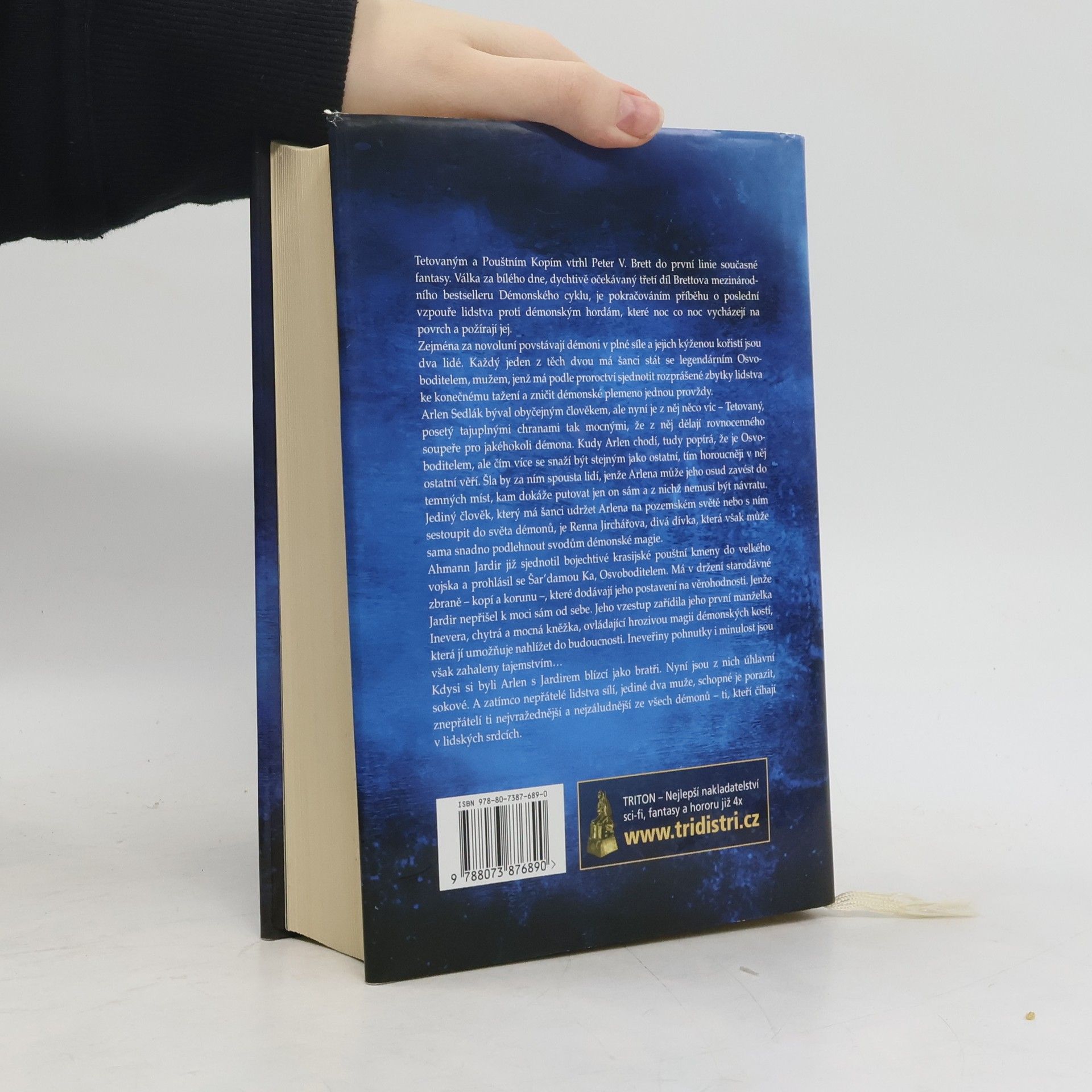 Válka za bílého dne, dychtivě očekávaný třetí díl Brettova mezinárodního bestselleru Démonského cyklu, je pokračováním příběhu o poslední vzpouře lidstva proti démonským hordám, které noc co noc vycházejí na povrch a požírají jej. Zejména za novoluní povstávají démoni v plné síle a jejich kýženou kořistí jsou dva lidé. Každý jeden z těch dvou má šanci stát se legendárním Osvoboditelem, mužem, jenž má podle proroctví sjednotit rozprášené zbytky lidstva ke konečnému tažení a zničit démonské plemeno jednou provždy. Arlen Sedlák býval obyčejným člověkem, ale nyní je z něj něco víc – Tetovaný, posetý tajuplnými chranami tak mocnými, že z něj dělají rovnocenného soupeře pro jakéhokoli démona. Ahmann Jardir již sjednotil bojechtivé krasijské pouštní kmeny do velkého vojska a prohlásil se Šar'damou Ka, Osvoboditelem. Jeho vzestup zařídila jeho první manželka Inevera, chytrá a mocná kněžka, ovládající hrozivou magii démonských kostí, která jí umožňuje nahlížet do budoucnosti. Kdysi si byli Arlen s Jardirem blízcí jako bratři. Nyní jsou z nich úhlavní sokové. A zatímco nepřátelé lidstva sílí, jediné dva muže, schopné je porazit, znepřátelí ti nejvražednější a nejzáludnější ze všech démonů – ti, kteří číhají v lidských srdcích -- 1. vydání. -- zdroj: www.legie.info --