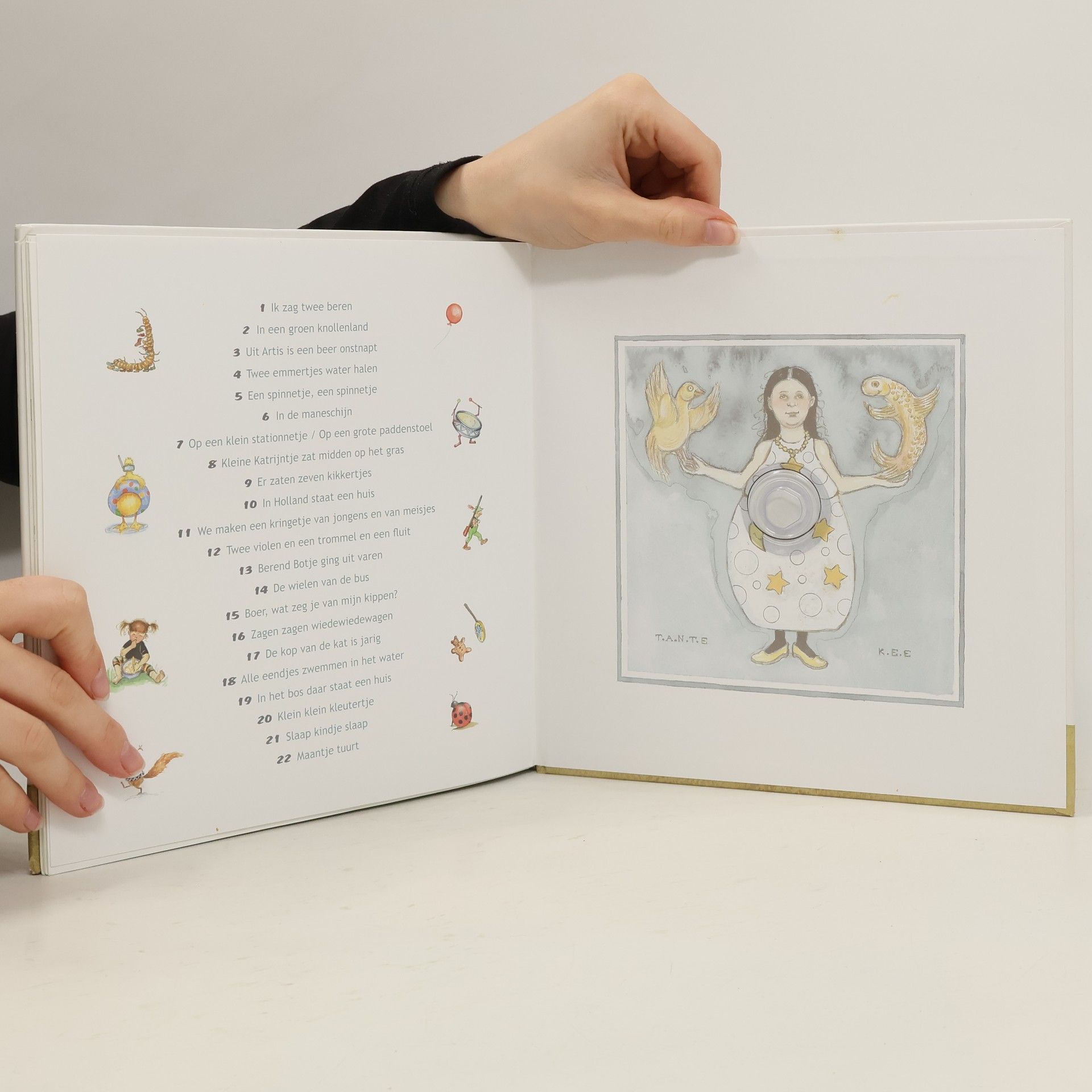 Liedteksten van 22 bekende en enige minder bekende liedjes. Met paginagrote grappige kleurenillustraties. Vanaf ca. 2 t/m 6 jaar.